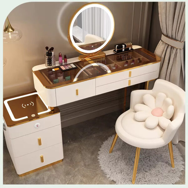 Bàn Trang Điểm Cao Cấp Màu Ghi Xám – Gương Tròn Đèn LED Viền Vàng & Ghế Nhung Lưng Hoa