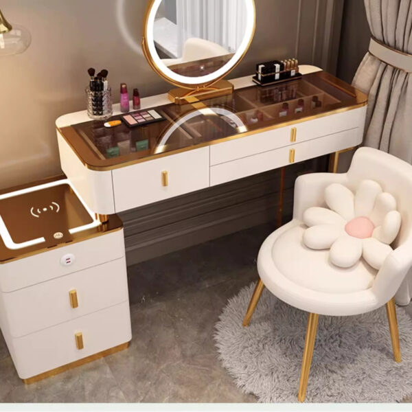 Đẳng cấp, thời thượng và tiện nghi – mẫu bàn trang điểm hiện đại màu ghi xám mặt kính đen kết hợp với gương tròn LED và ghế nhung lưng hoa chính là điểm nhấn hoàn hảo cho mọi không gian phòng ngủ nữ tính, thanh lịch.