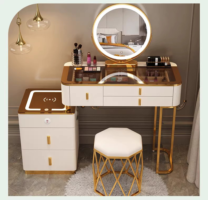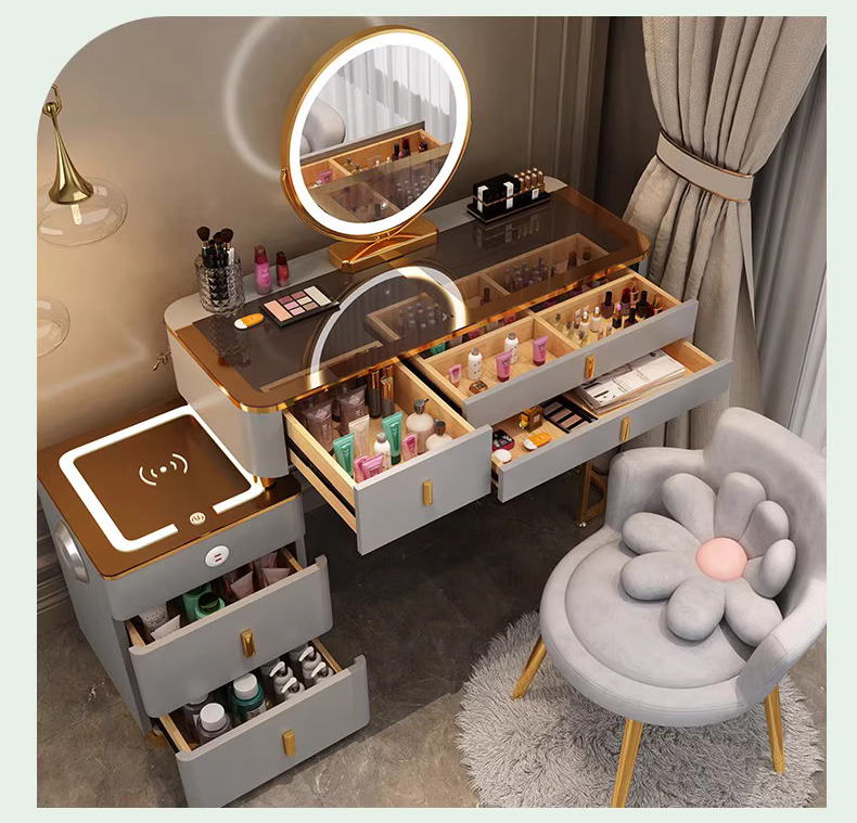 Bàn Trang Điểm Cao Cấp Màu Ghi Xám – Gương Tròn Đèn LED Viền Vàng & Ghế Nhung Lưng Hoa