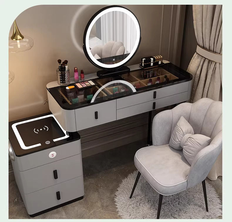 Đẳng cấp, thời thượng và tiện nghi – mẫu bàn trang điểm hiện đại màu ghi xám mặt kính đen kết hợp với gương tròn LED và ghế nhung lưng hoa chính là điểm nhấn hoàn hảo cho mọi không gian phòng ngủ nữ tính, thanh lịch.