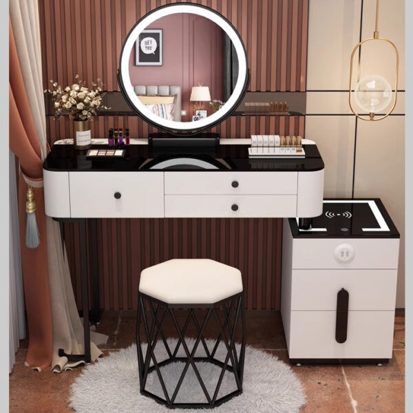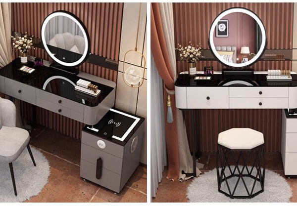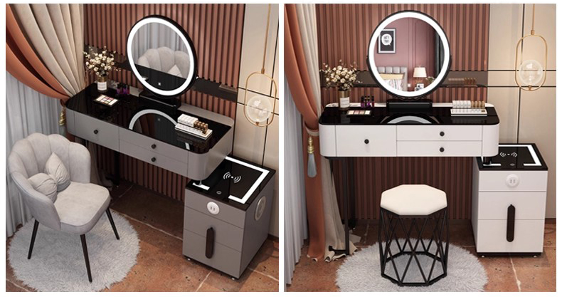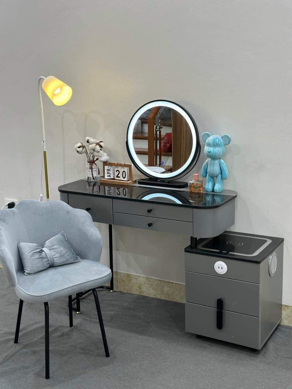 Bạn đang tìm kiếm một mẫu bàn trang điểm thông minh, hiện đại, đẹp mắt và tiện nghi để hoàn thiện không gian sống của mình? Mẫu bàn trang điểm màu ghi xám kèm gương tròn đèn LED và ghế nhung cao cấp dưới đây sẽ là điểm nhấn hoàn hảo cho phòng ngủ của bạn – vừa tinh tế, sang trọng lại cực kỳ tiện dụng.