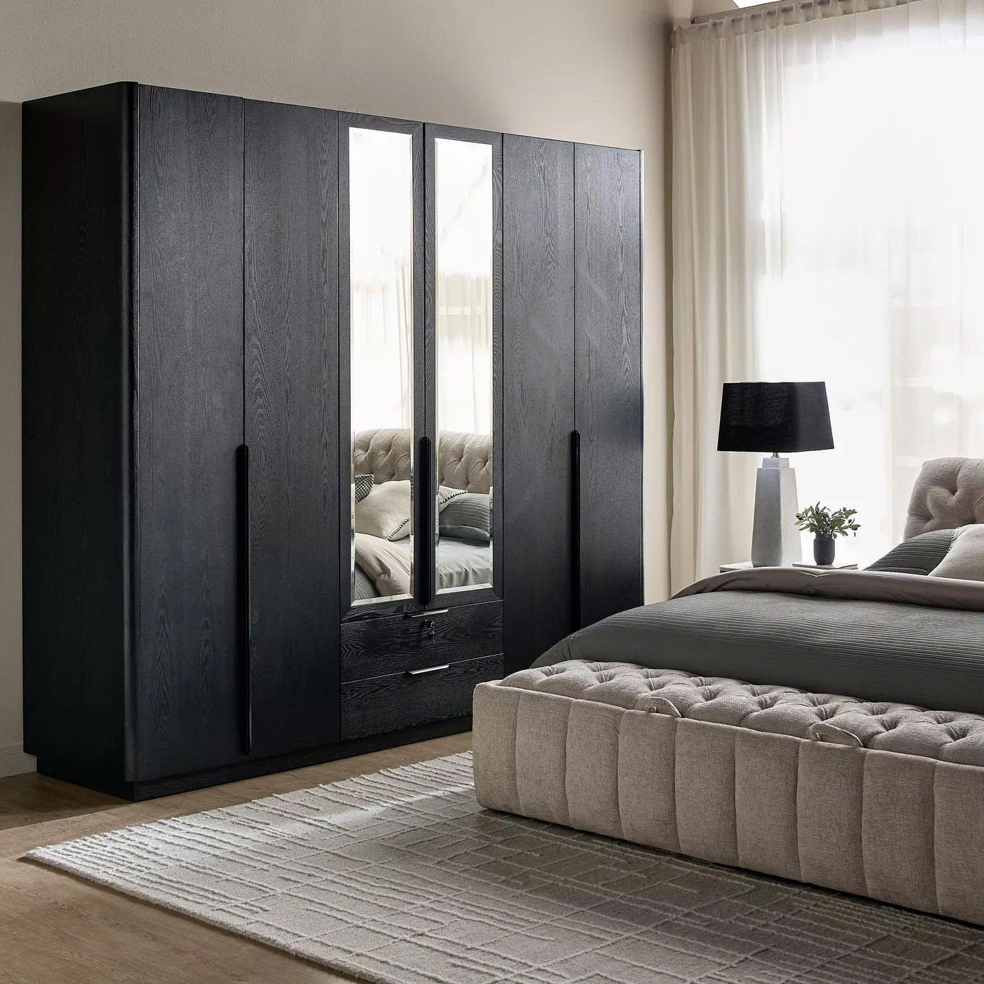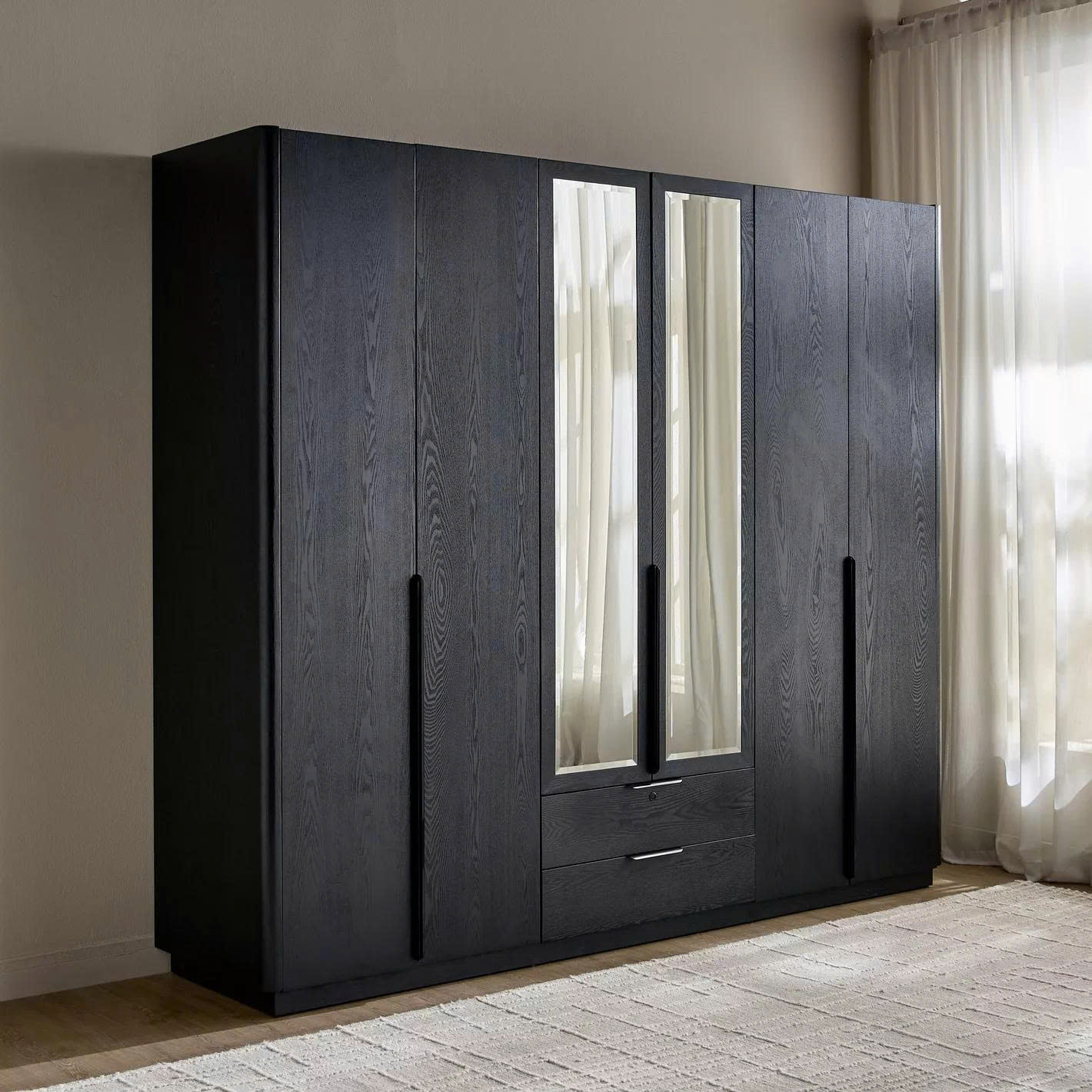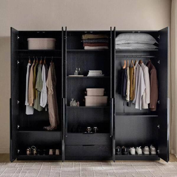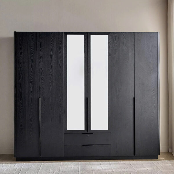 Mẫu Tủ Quần Áo Gỗ Tự Nhiên Màu Đen Hiện Đại 6 Cánh Kính Gương