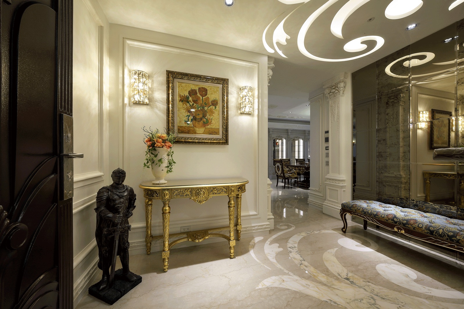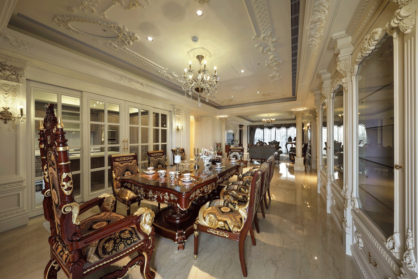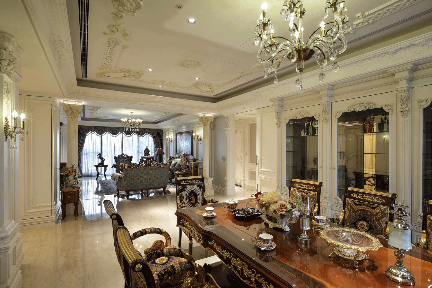 Ánh sáng: Kết hợp đèn trần pha lê, đèn tường trang trí và ánh sáng tự nhiên từ hệ cửa kính lớn.