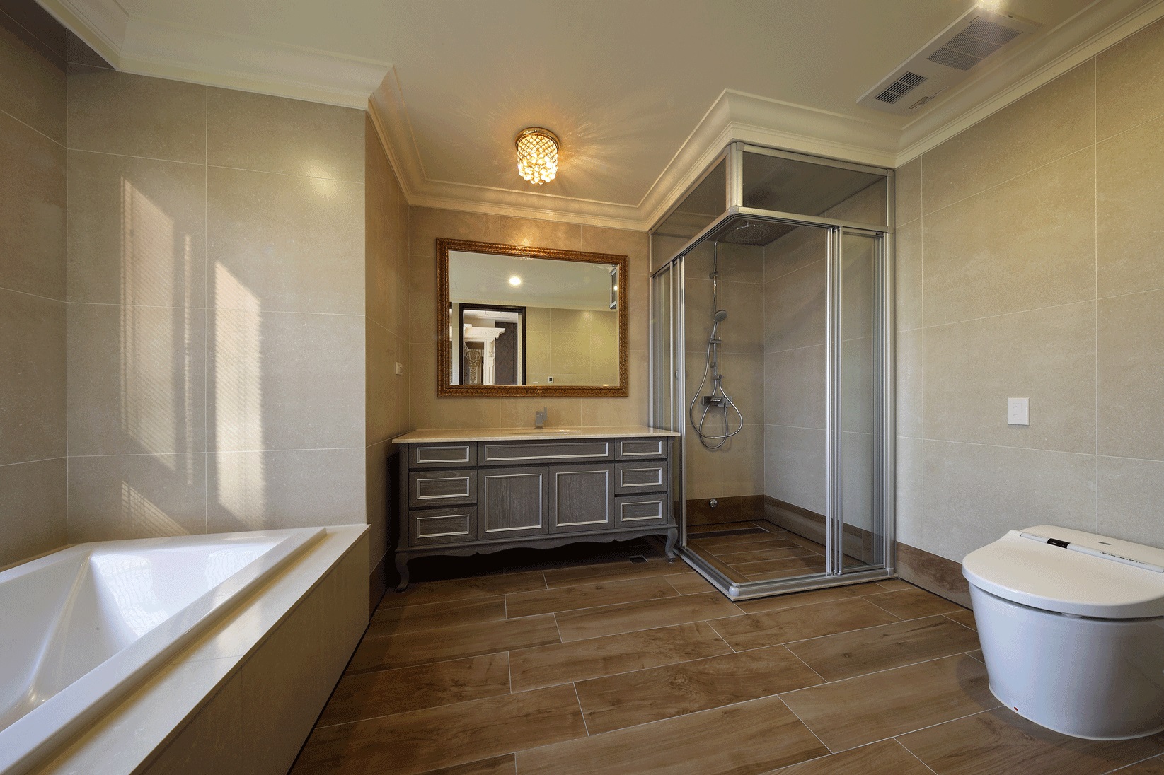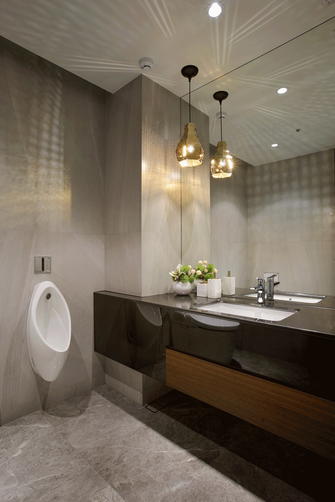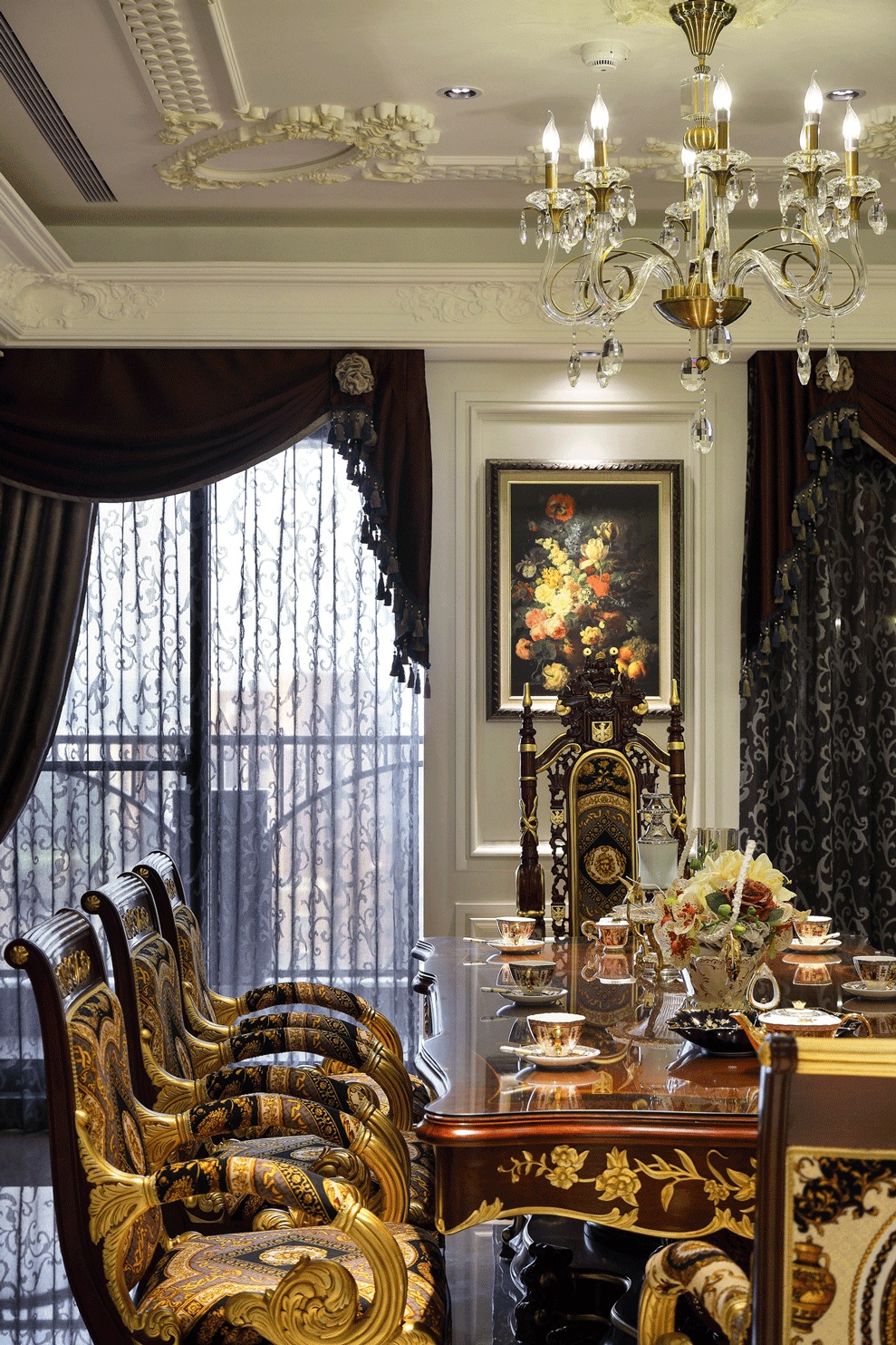 Ánh sáng: Kết hợp đèn trần pha lê, đèn tường trang trí và ánh sáng tự nhiên từ hệ cửa kính lớn.