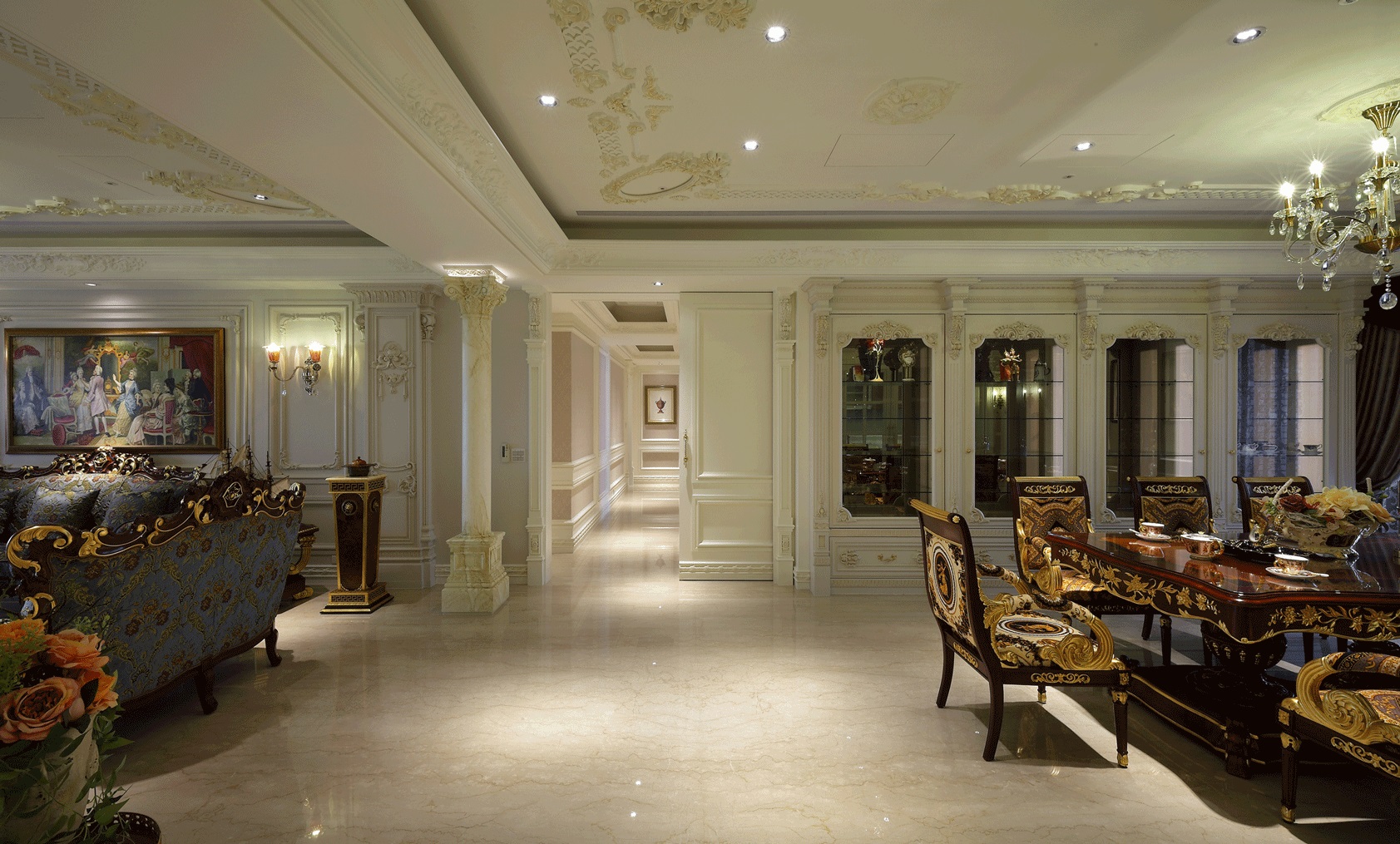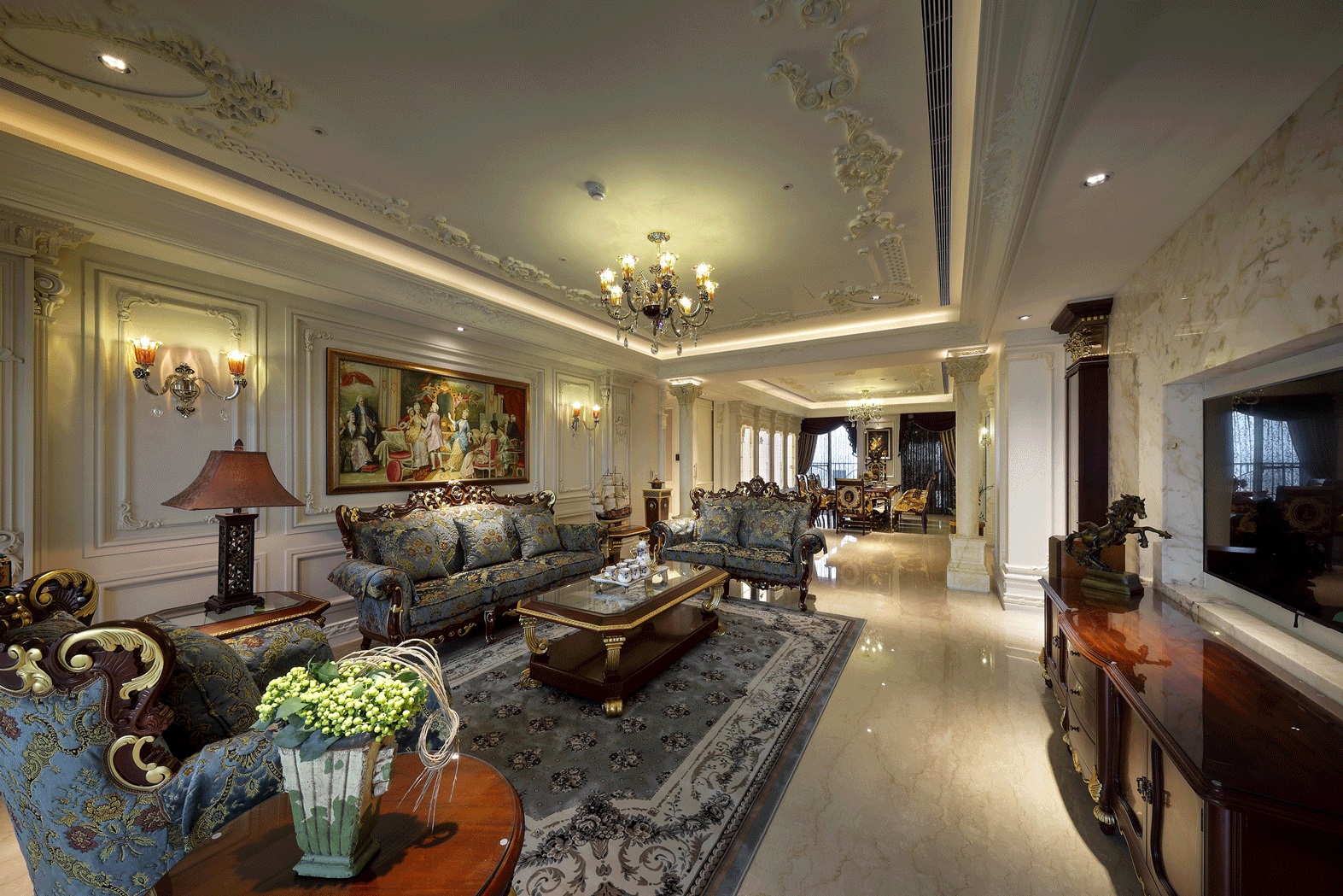 Không gian phòng khách rộng rãi, kết hợp hài hòa giữa ánh sáng tự nhiên và nội thất sang trọng, mang lại cảm giác ấm cúng mà vẫn vô cùng quyền quý. Bức tranh treo tường cổ điển, tượng decor nghệ thuật và bộ sưu tập đồ trang trí tinh tế chính là điểm nhấn thể hiện gu thẩm mỹ của gia chủ.