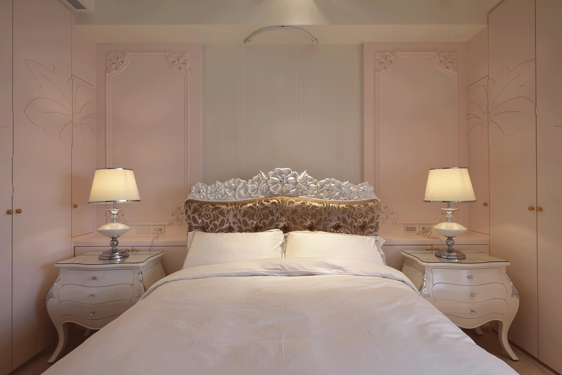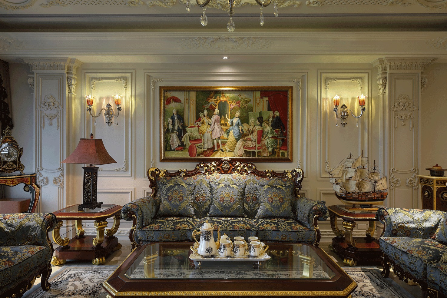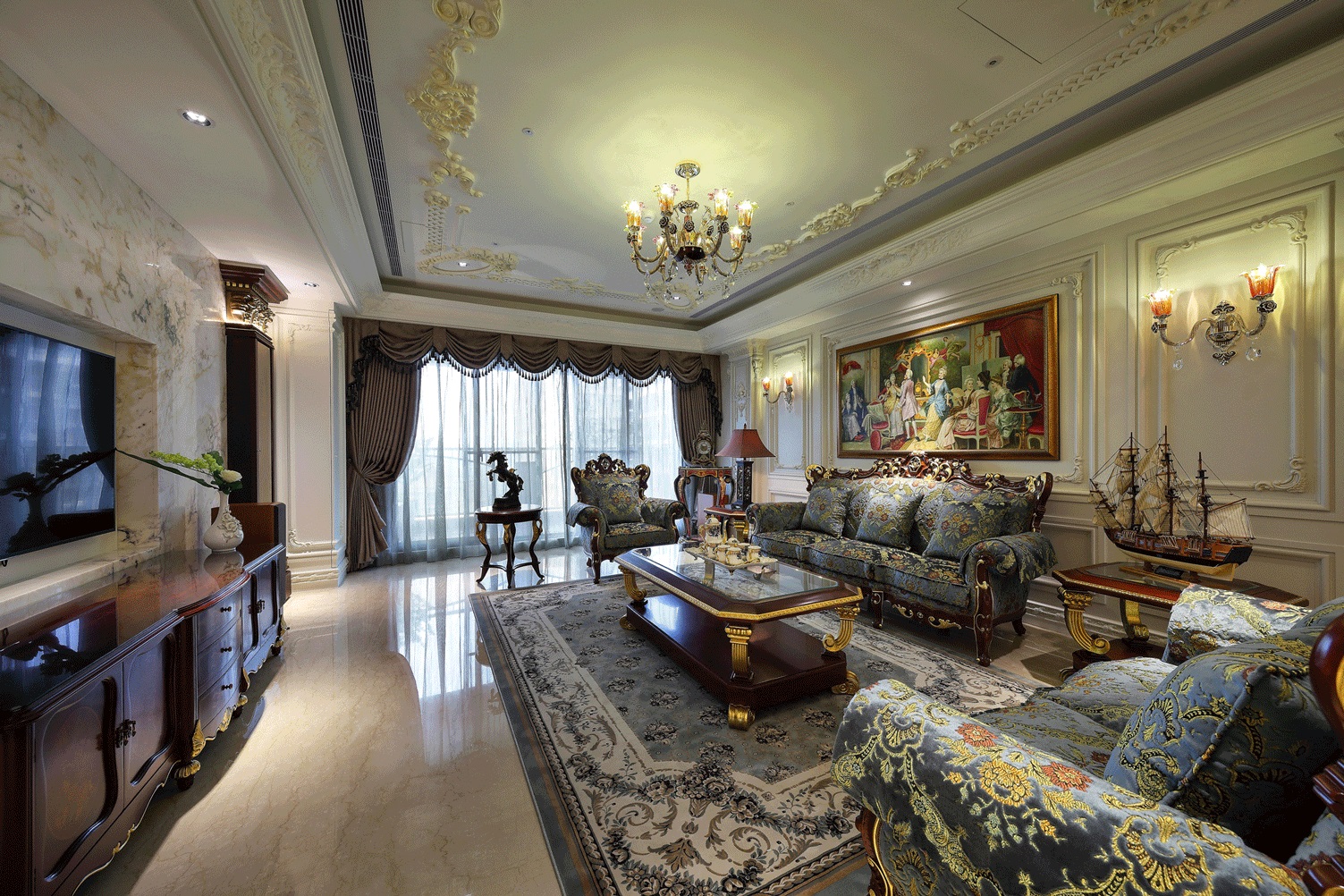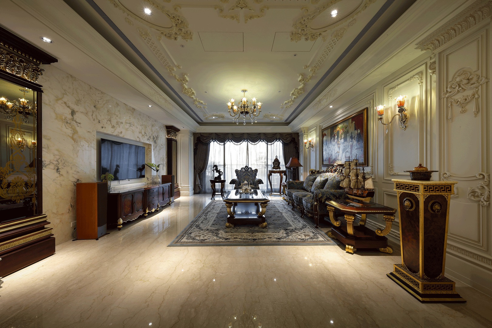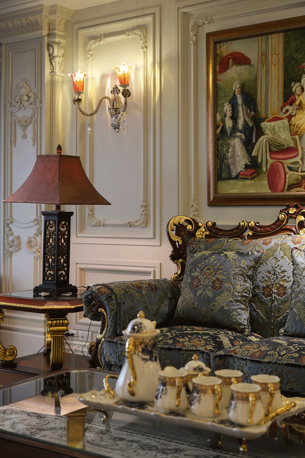 Chất liệu nội thất: Gỗ tự nhiên, vải nhung thêu hoa văn, đá marble cao cấp.