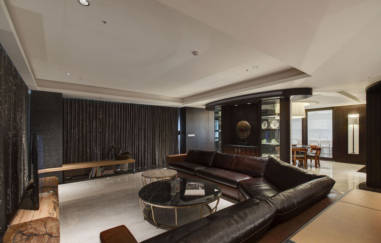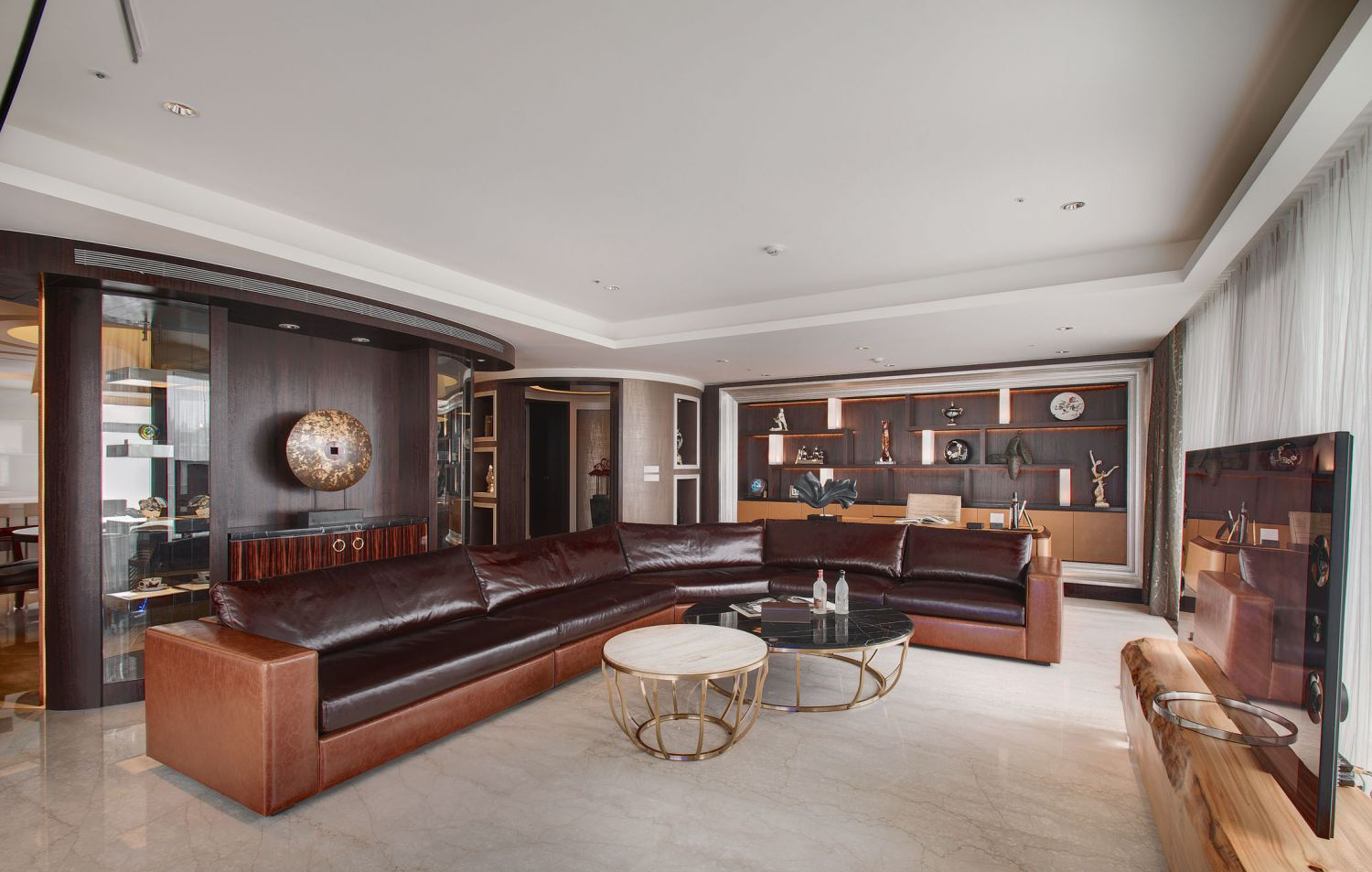 Tông màu nâu chocolate – đen đá – ánh kim, được phối hài hòa giữa nội thất gỗ tự nhiên, sofa da cao cấp và bề mặt đá marble tạo nên cảm giác sang trọng, ấm cúng nhưng không kém phần mạnh mẽ.