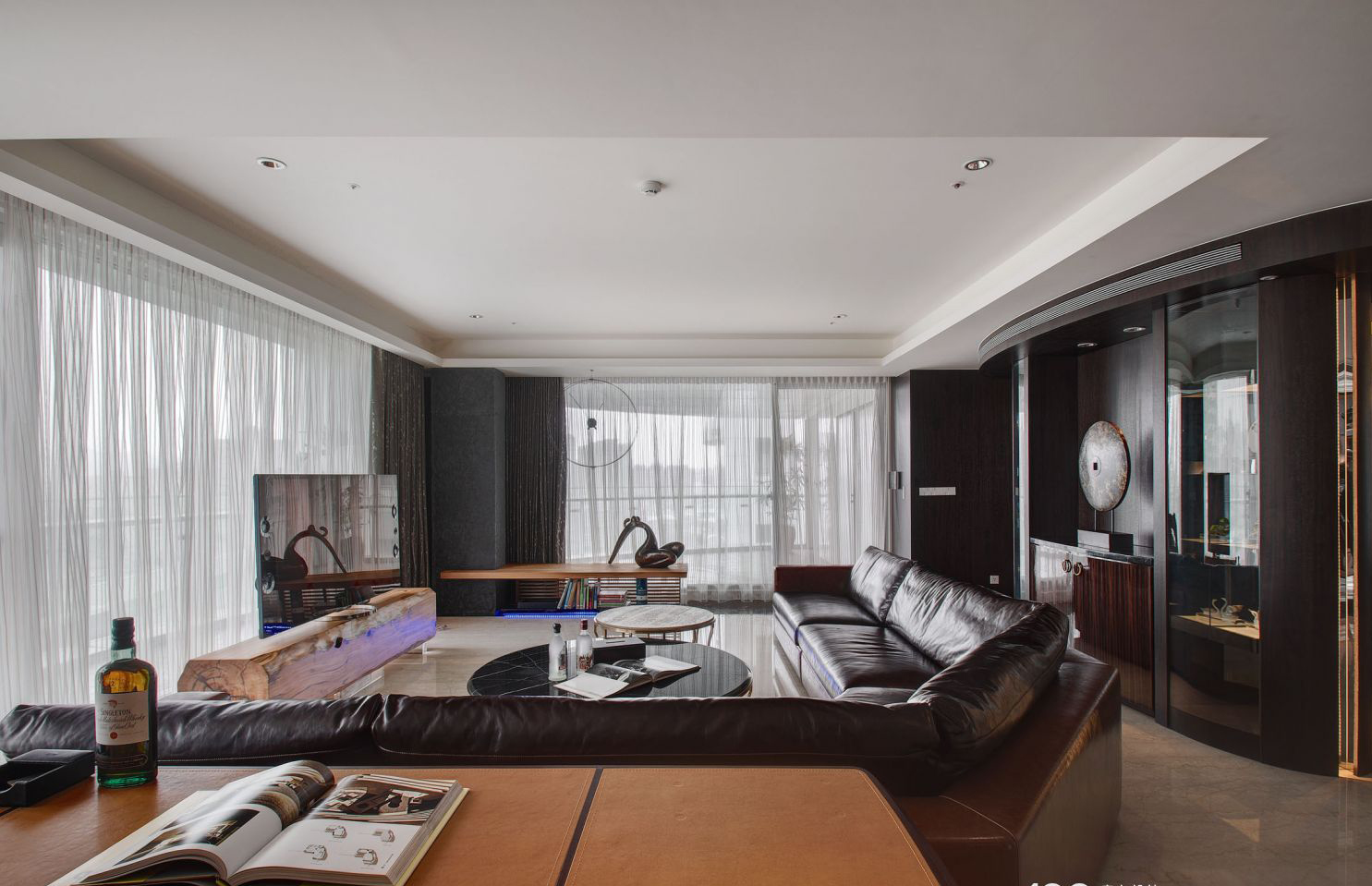 Tivi treo kính nghệ thuật, bàn trà đá đen vân trắng và bàn phụ tròn tạo bố cục đối xứng đẹp mắt, hài hòa giữa công năng và thẩm mỹ.