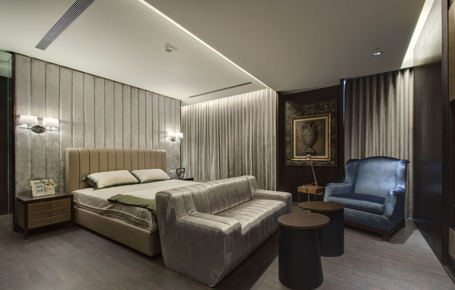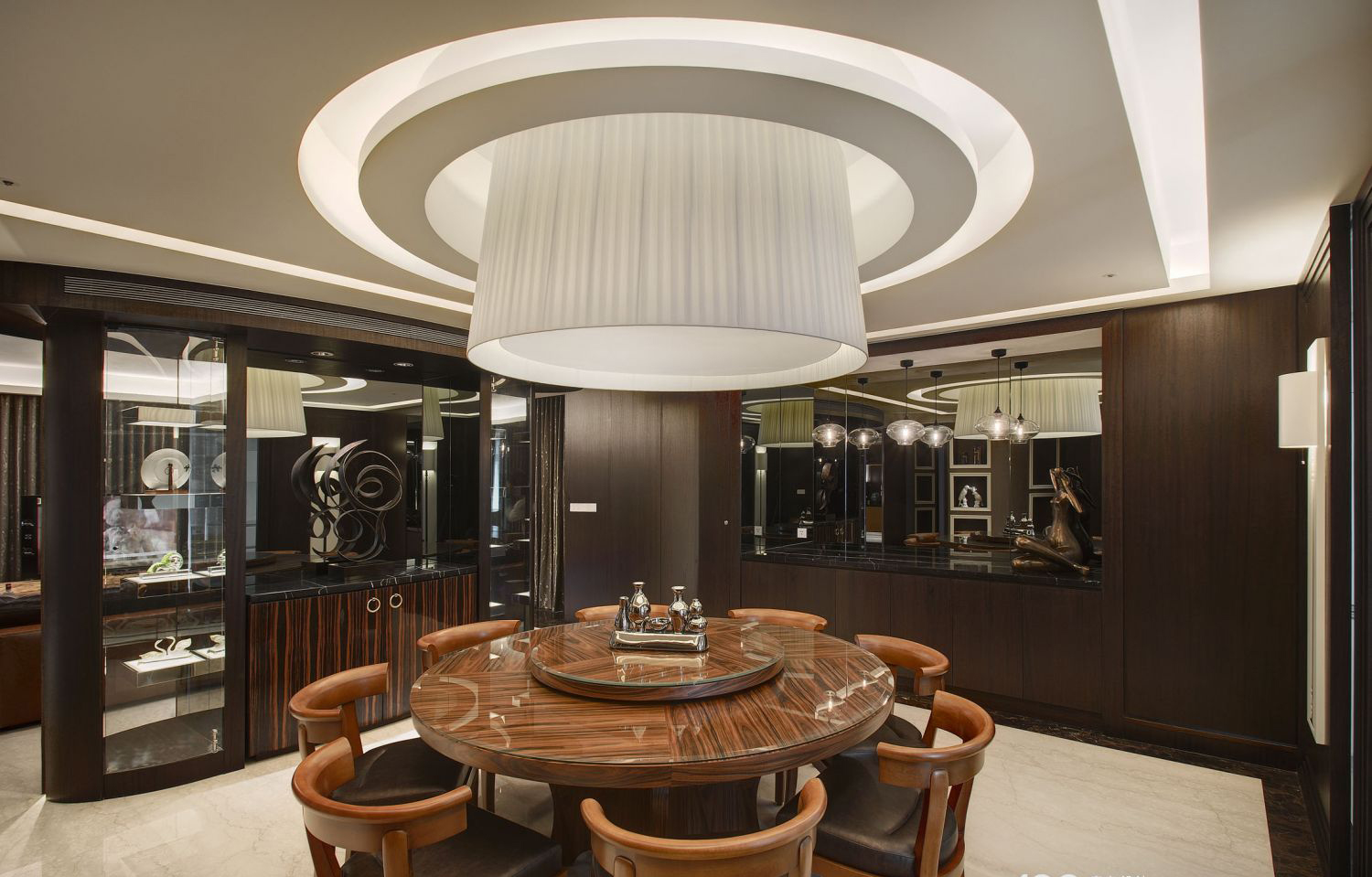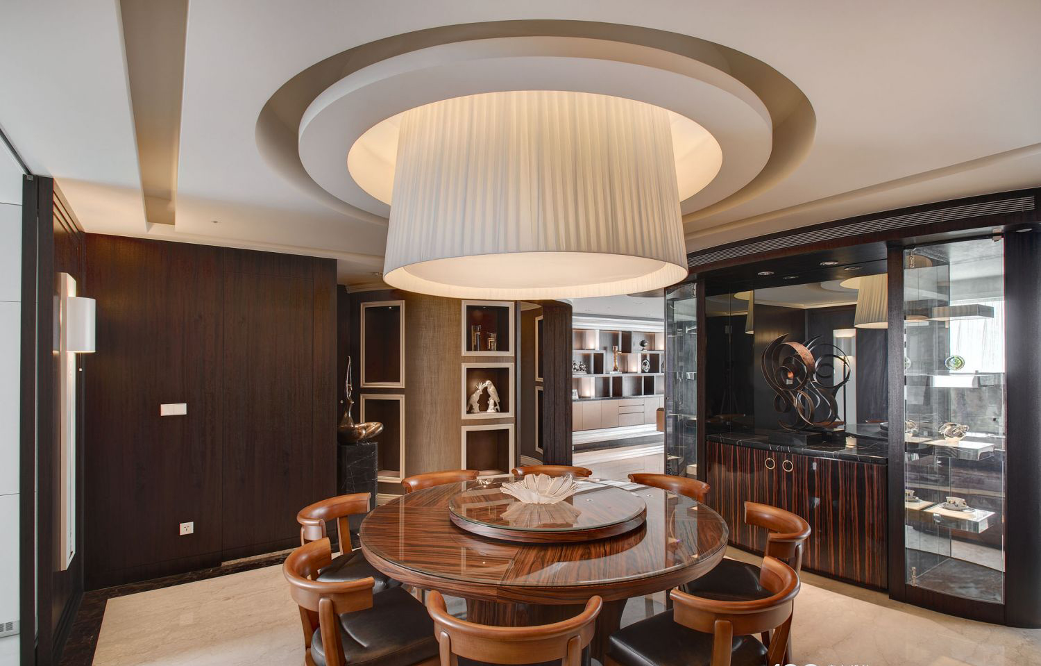Kệ TV và tủ rượu được thiết kế âm tường, ốp veneer cao cấp và điểm nhấn kim loại giúp tối ưu diện tích mà vẫn đảm bảo sự hiện diện sang trọng.
