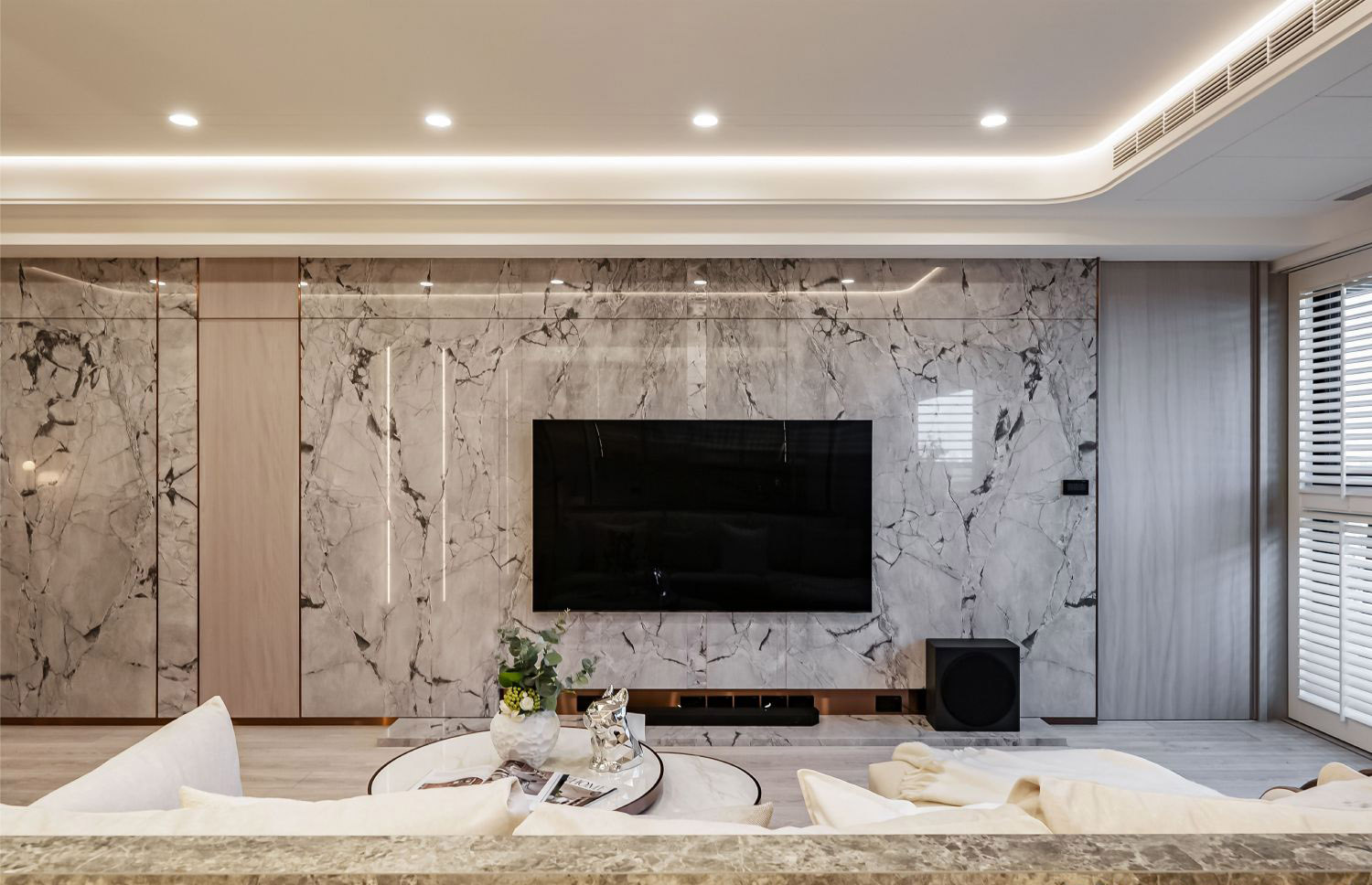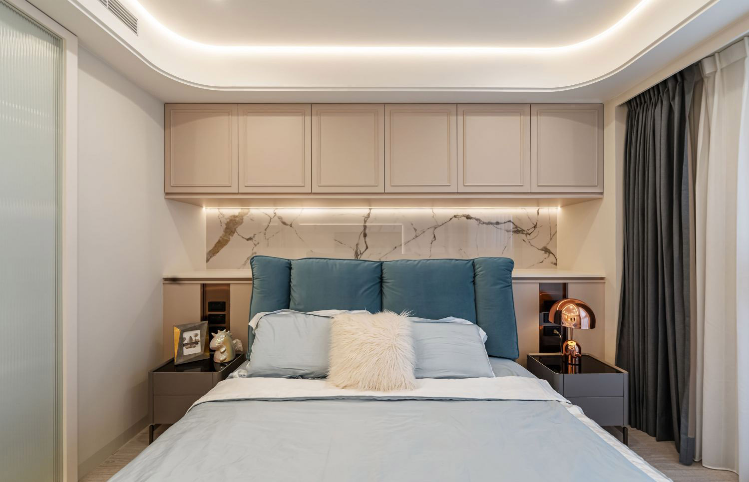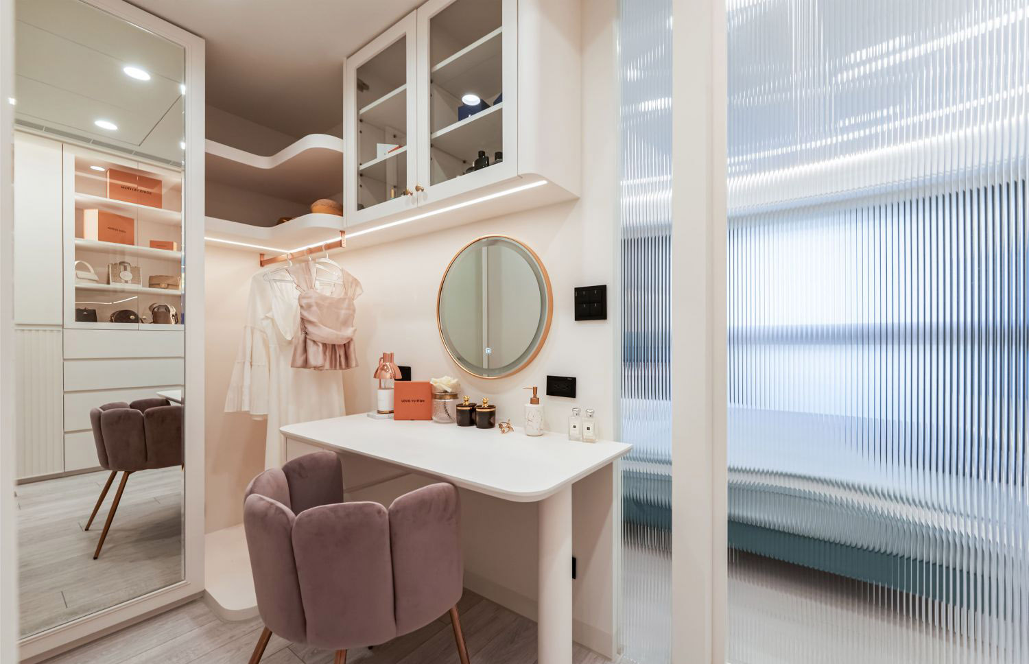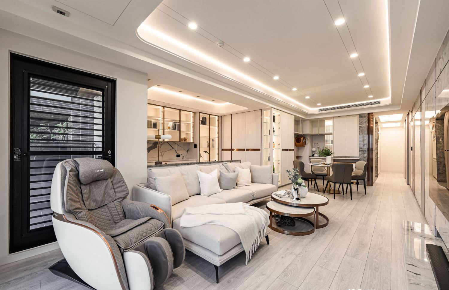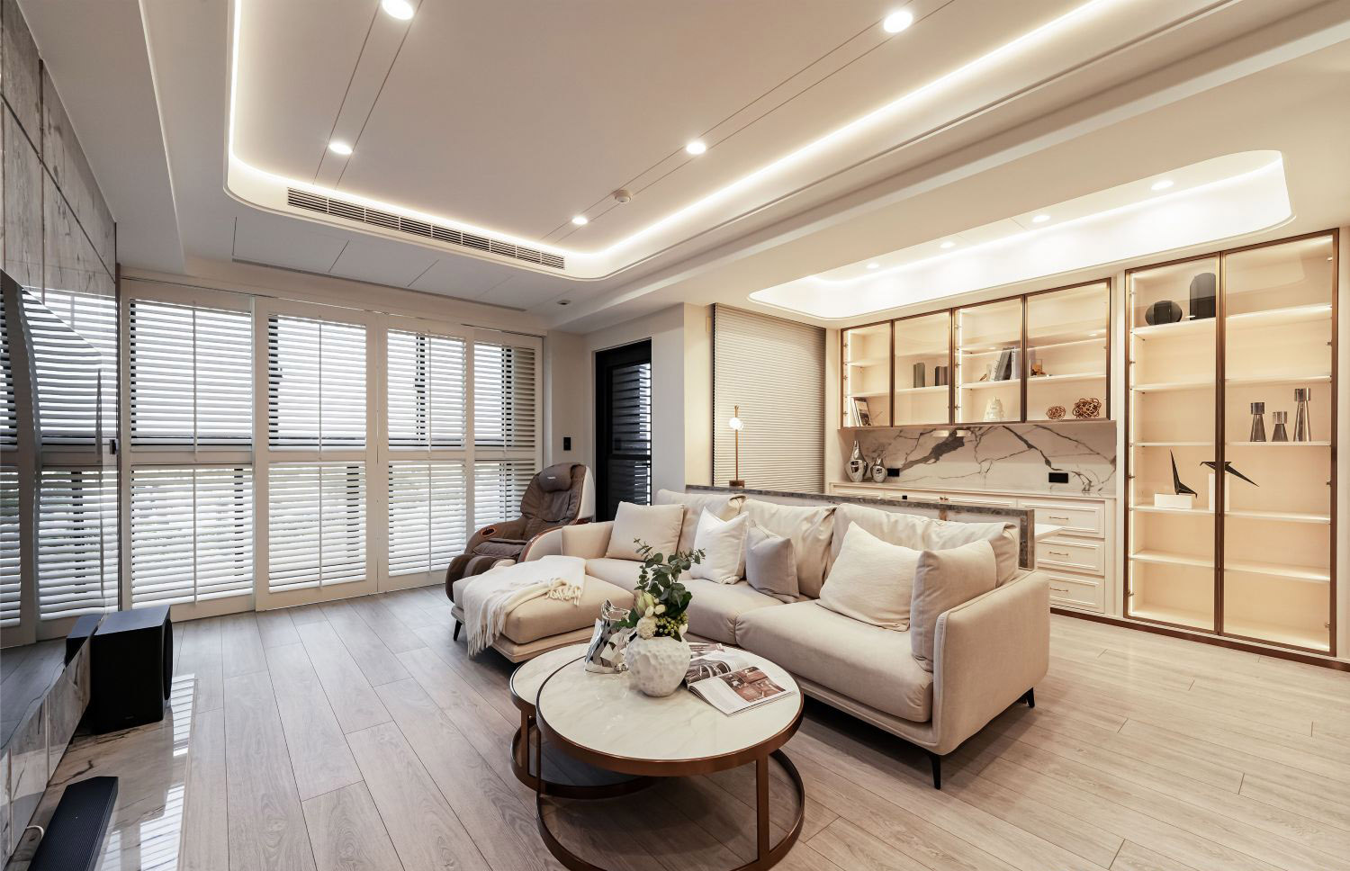 Nội thất được lựa chọn kỹ lưỡng với các chất liệu cao cấp, kết hợp giữa đường nét hiện đại và sự ấm cúng, tạo nên không gian sống vừa tinh tế, vừa tiện nghi. Mỗi chi tiết từ sofa, bàn trang điểm, tủ kệ cho đến phụ kiện trang trí đều được đặt làm nổi bật nét sang trọng đương đại. -