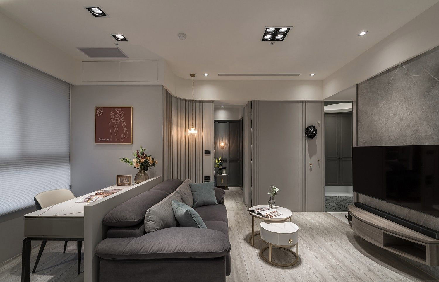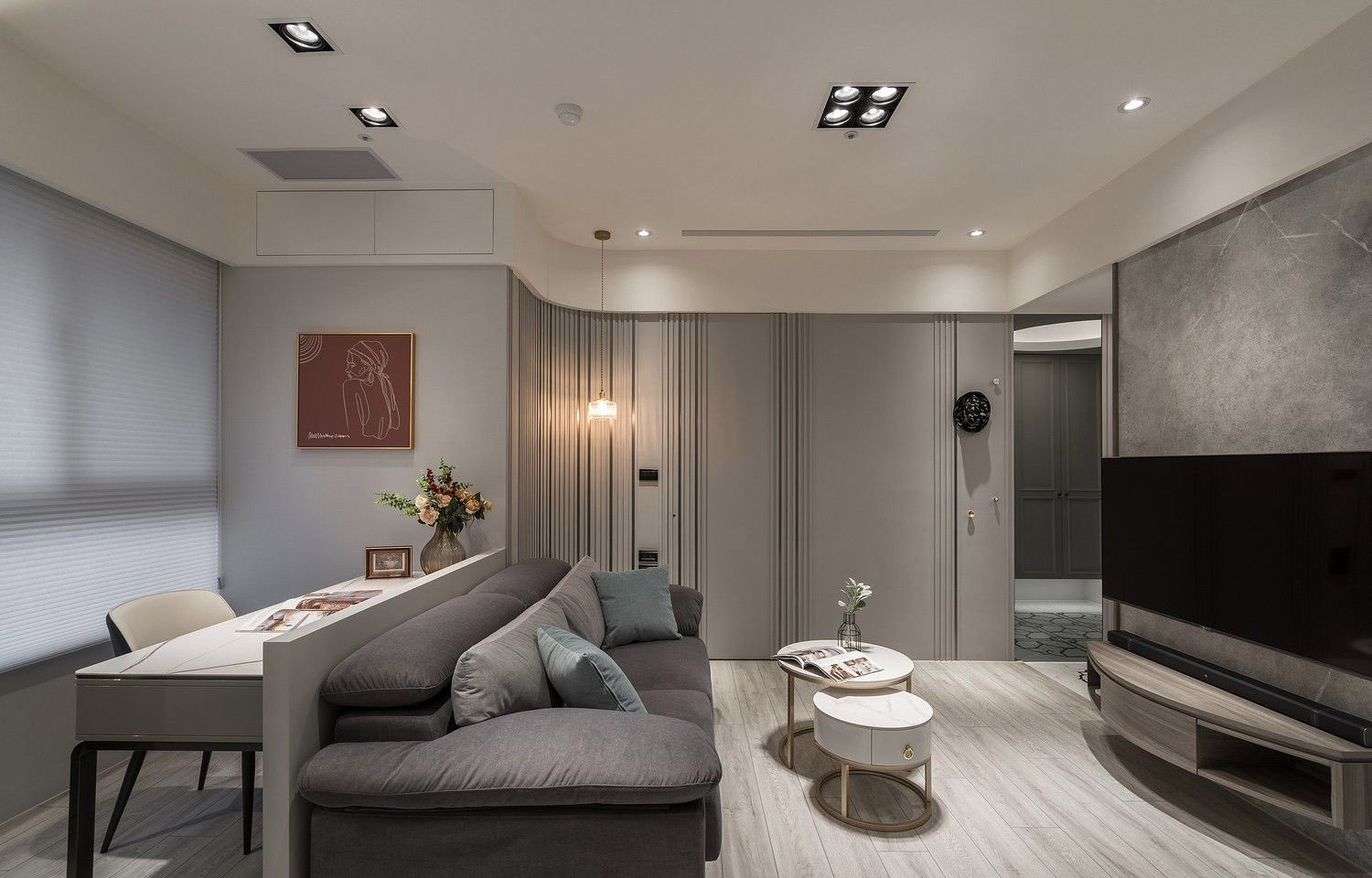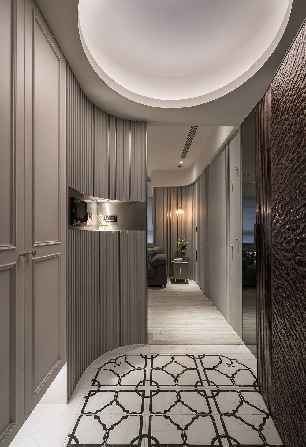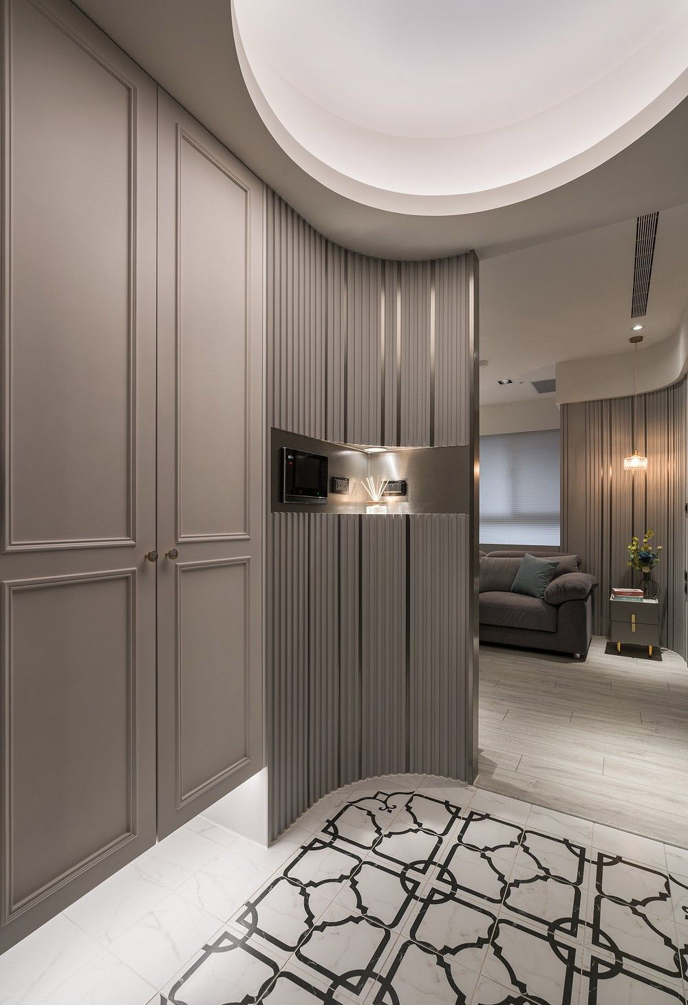 Sảnh vào căn hộ ấn tượng với gạch hoa văn tân cổ điển, phân tách tinh tế với sàn gỗ khu vực sinh hoạt. Thiết kế đường cong mềm mại kết hợp lam gỗ sọc đứng tạo chiều sâu thị giác và cảm giác chào đón.