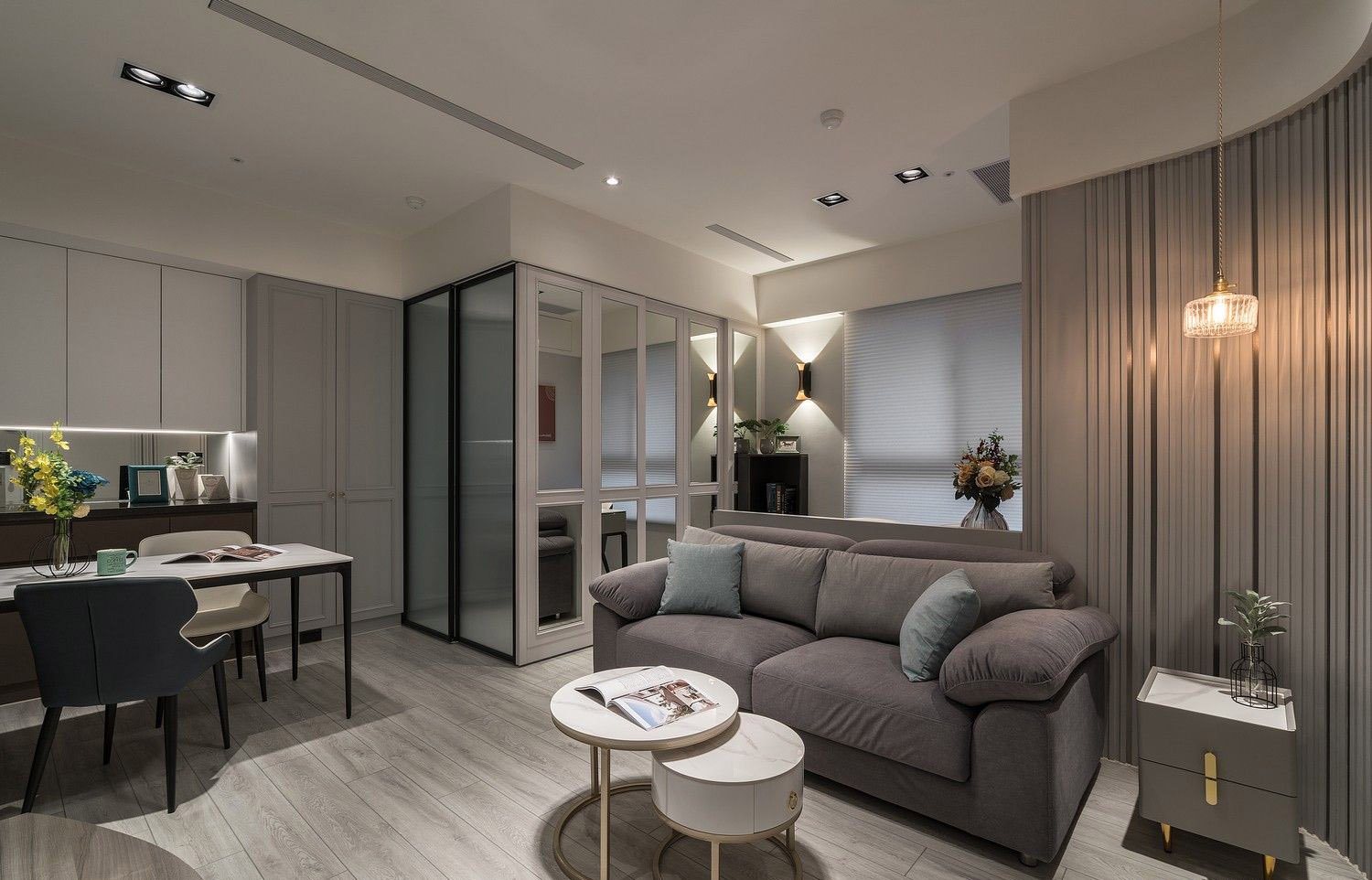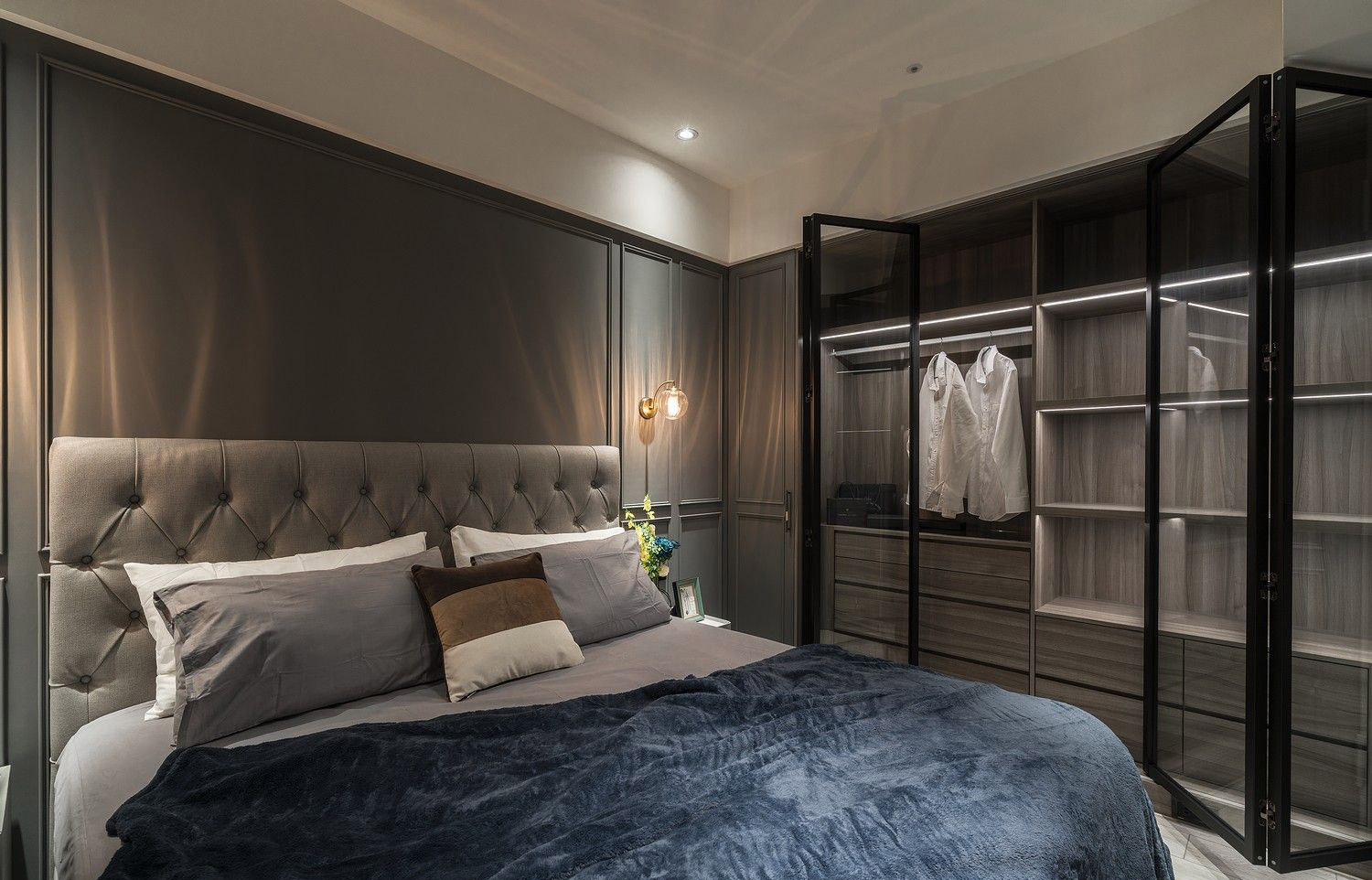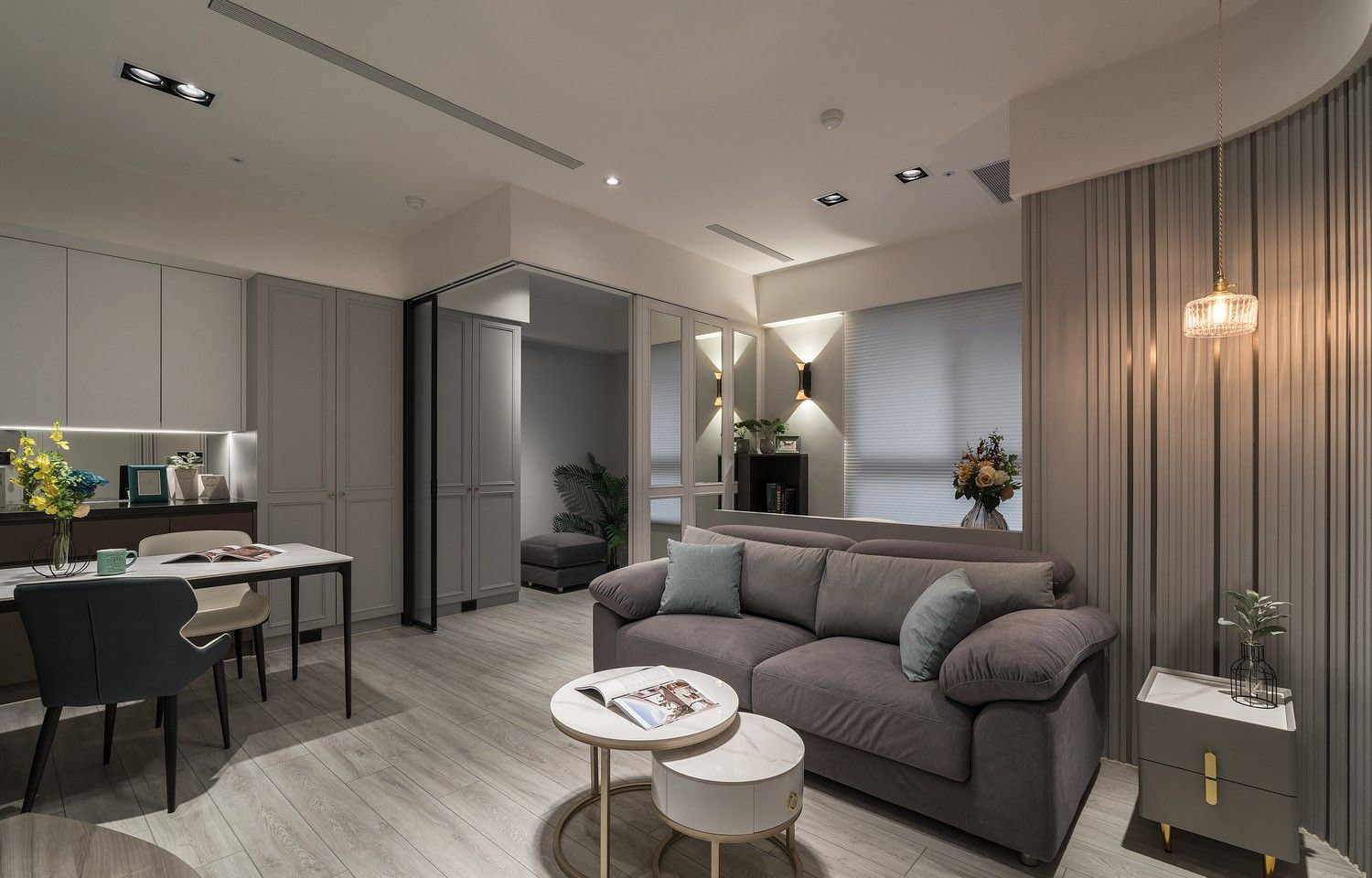 Hệ tủ âm tường đồng màu với tường, tay nắm dạng nút đồng cao cấp, vừa thẩm mỹ vừa tiết kiệm diện tích – lý tưởng cho những căn hộ cao cấp có diện tích tối ưu.
