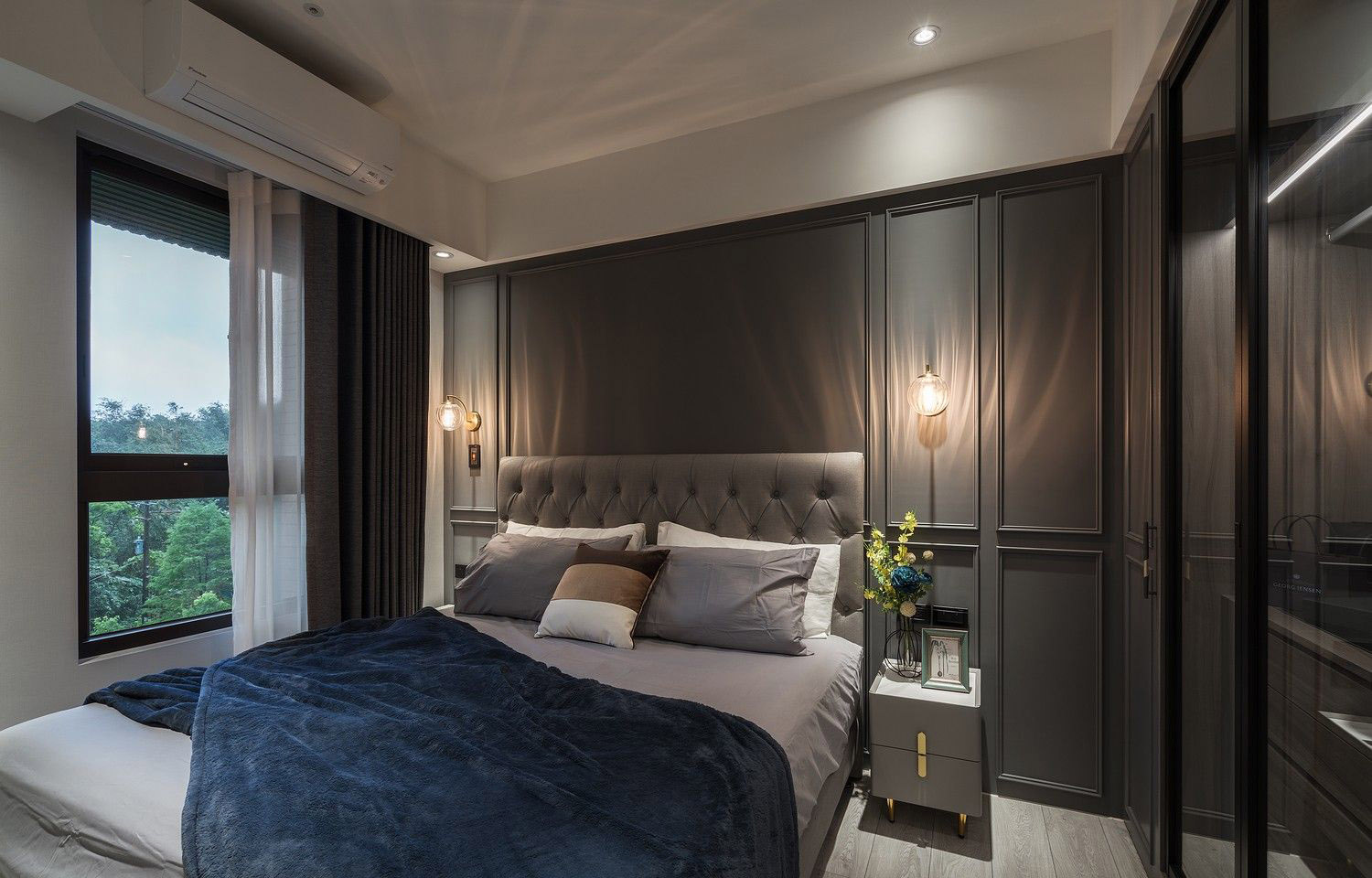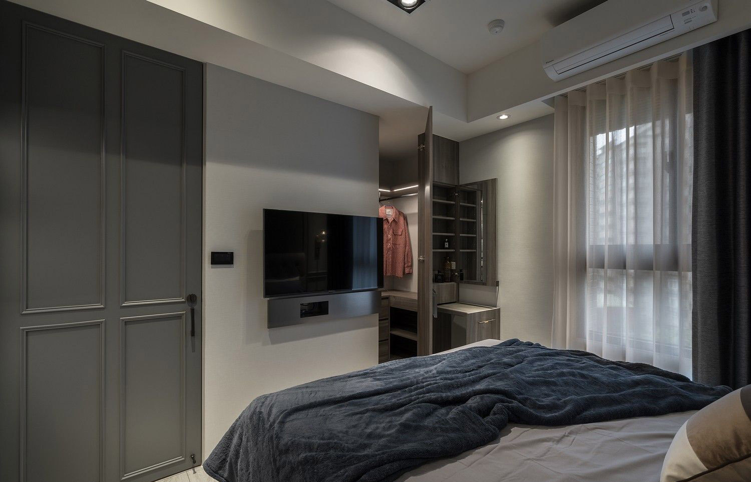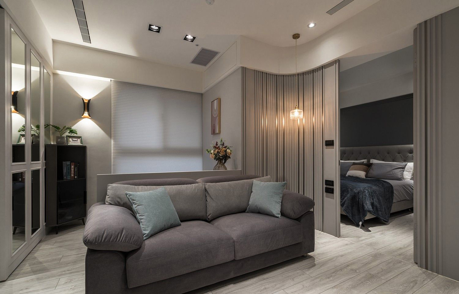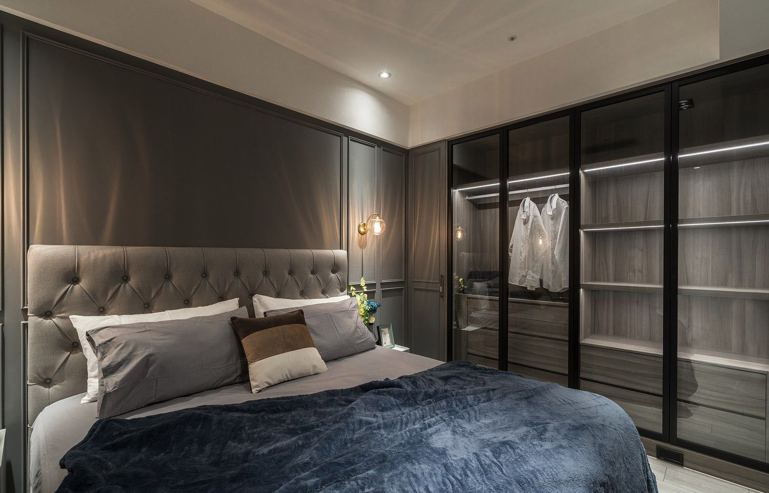 Hệ tủ âm tường đồng màu với tường, tay nắm dạng nút đồng cao cấp, vừa thẩm mỹ vừa tiết kiệm diện tích – lý tưởng cho những căn hộ cao cấp có diện tích tối ưu.