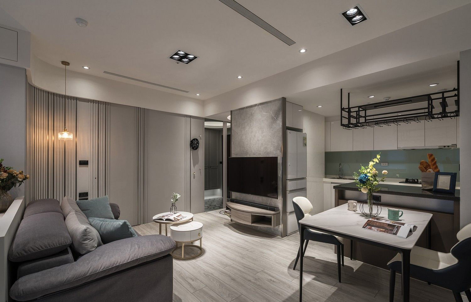 Đèn âm trần và khe sáng trần cong tạo ánh sáng dịu nhẹ, nhấn mạnh các chi tiết nội thất mà không gây chói, tăng cảm giác thư thái khi trở về nhà.
