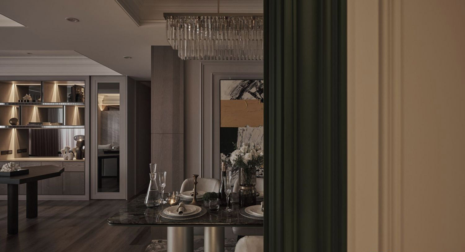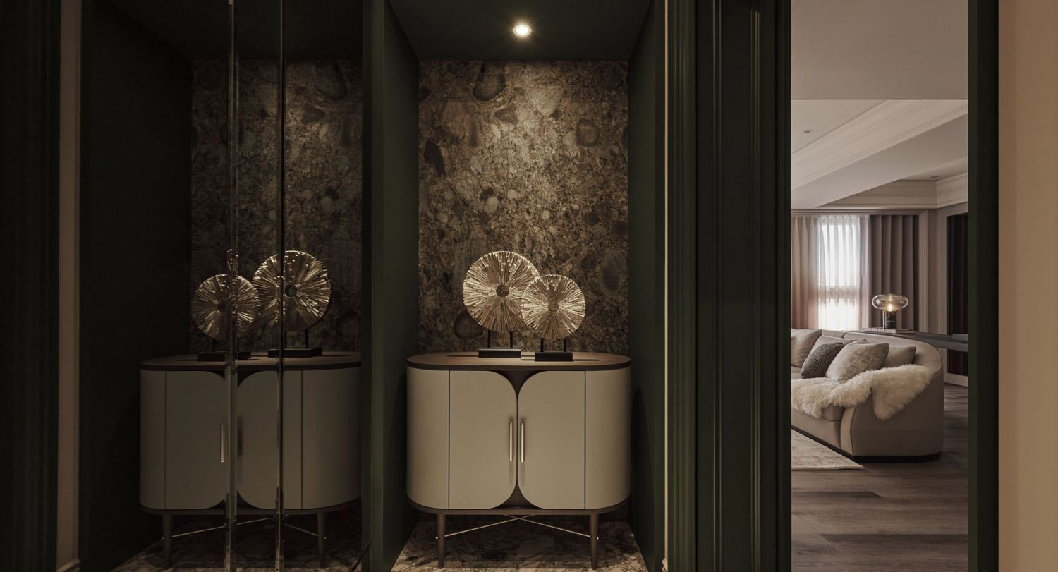Vật liệu cao cấp: Gỗ sẫm màu, đá tự nhiên, kim loại ánh vàng/brass.
