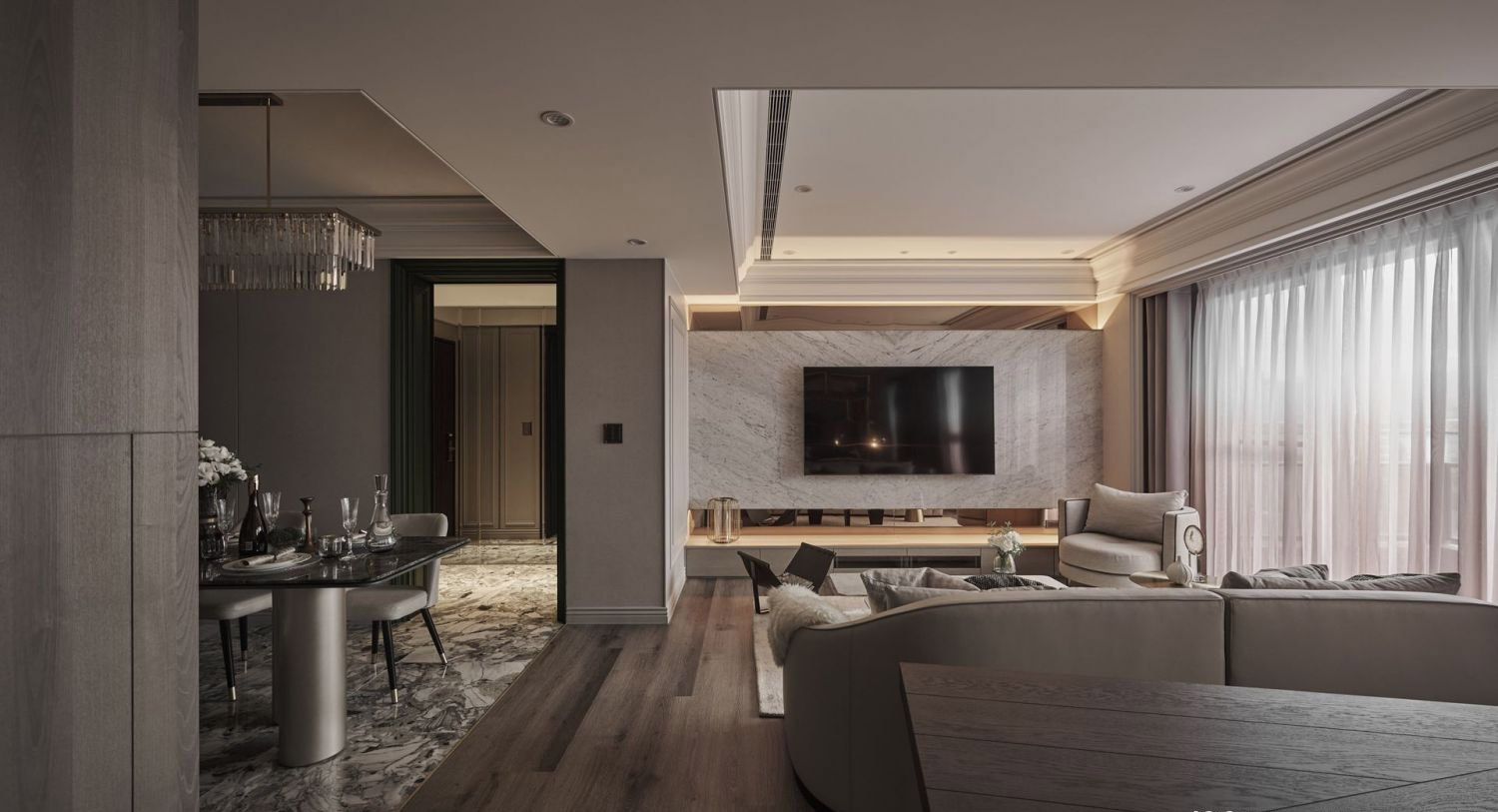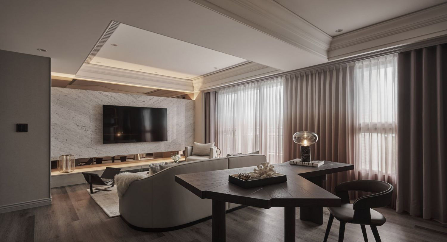 Vách tivi: Ốp đá marble trắng vân mây, tạo điểm nhấn sang trọng.