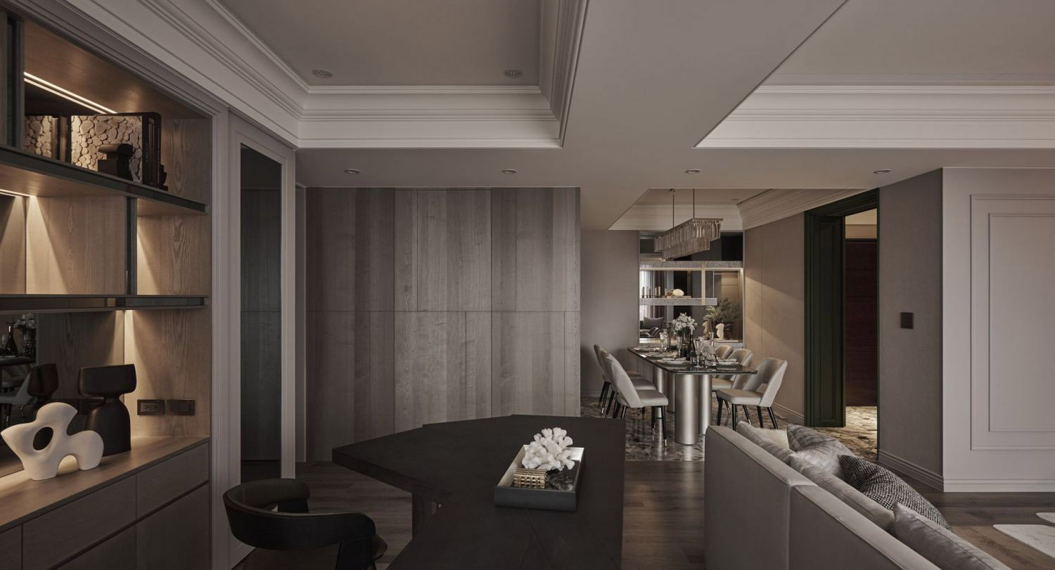 Không gian mở: Phòng khách – bàn làm việc – phòng ăn liên thông, tạo cảm giác rộng rãi và liền mạch.