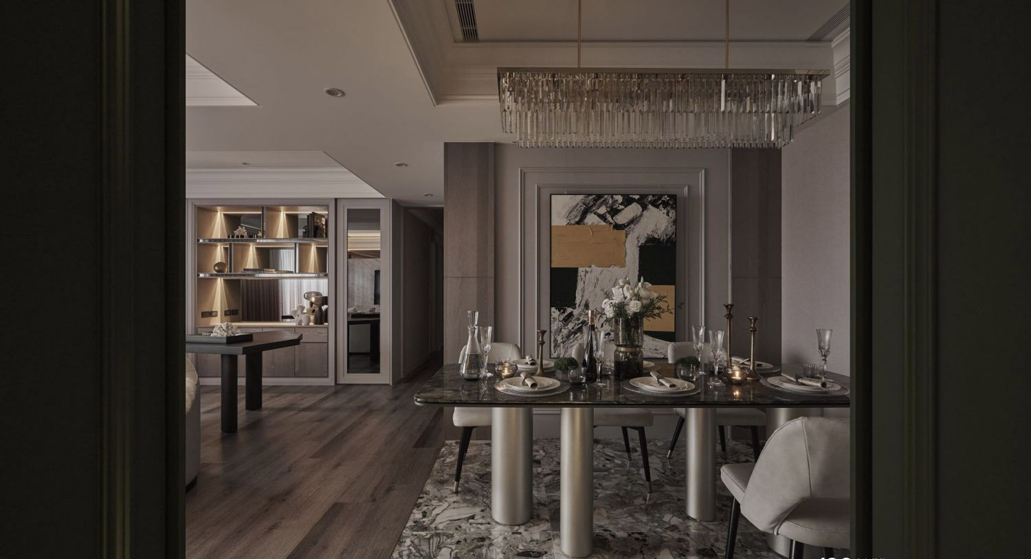 Trang trí: Tranh nghệ thuật trừu tượng lớn, tường ốp chỉ nổi, phối hợp hoàn hảo với không gian.