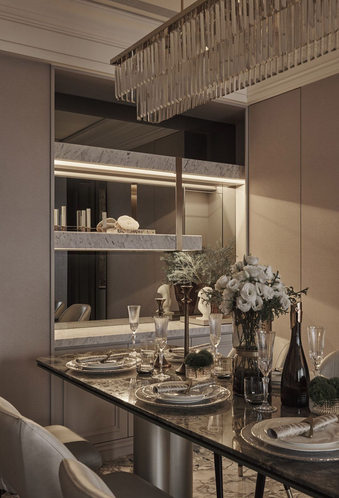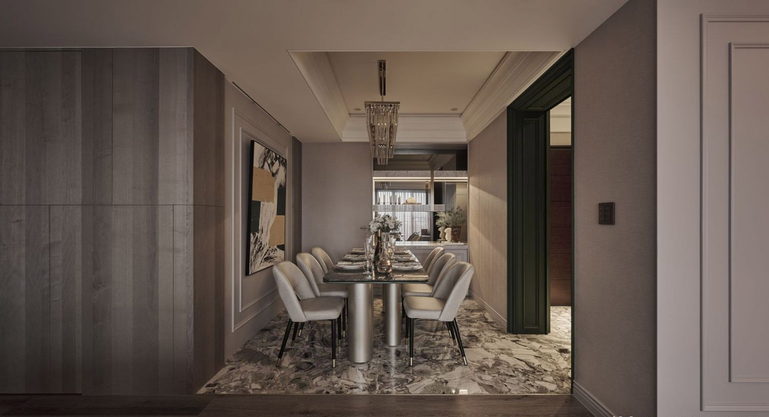 Bàn ăn: Mặt đá marble đen vân trắng, chân kim loại thiết kế trụ lớn tạo cảm giác chắc chắn và hiện đại.