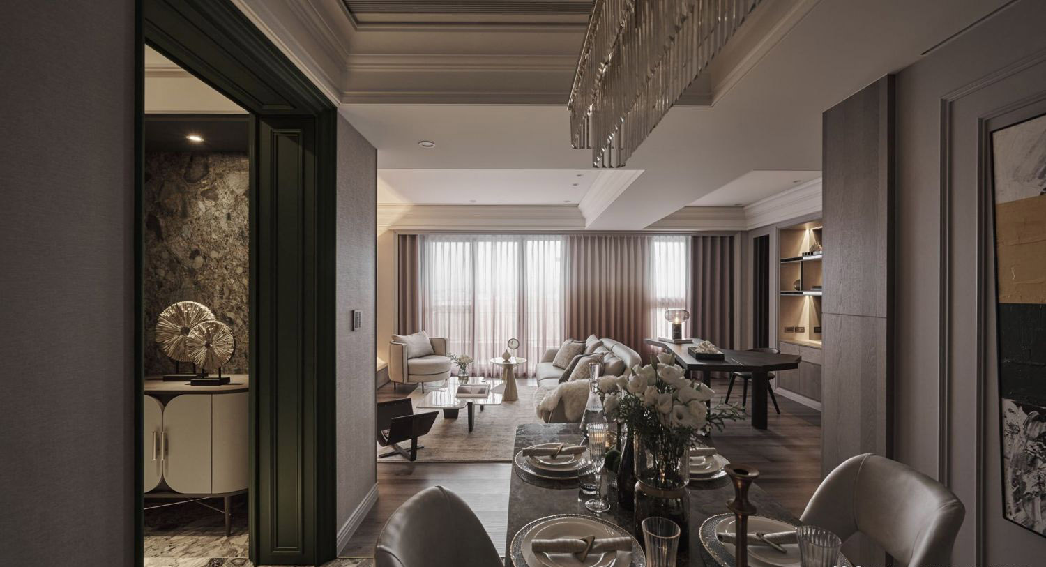 Đèn trần: Đèn pha lê treo dài, tạo hiệu ứng ánh sáng lung linh, sang trọng.