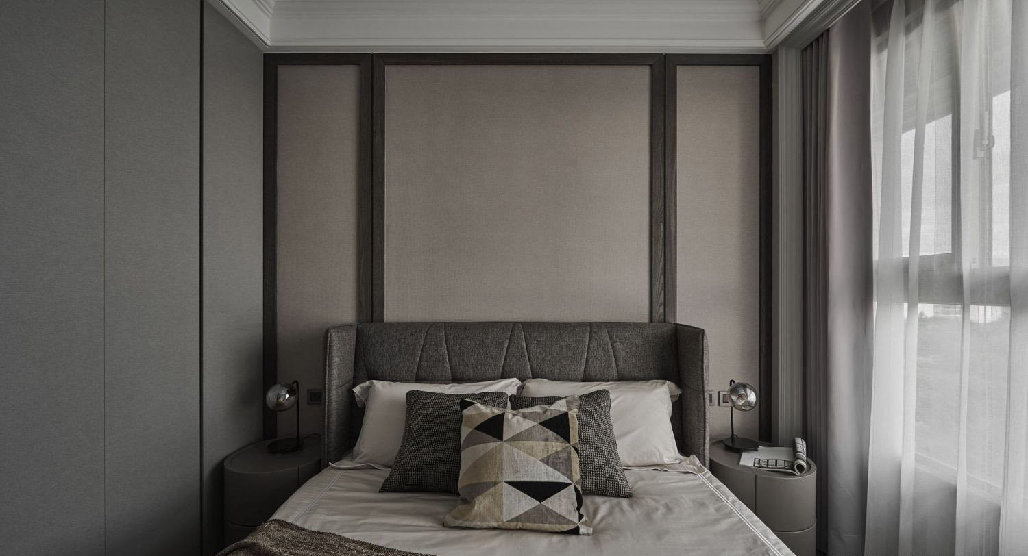 Giường ngủ: Tab đầu giường bọc vải nỉ kẻ sọc dọc, tạo cảm giác mềm mại và ấm cúng.