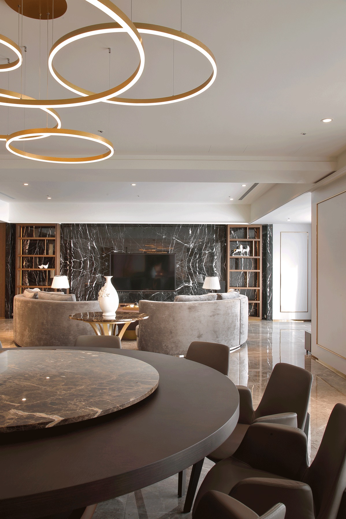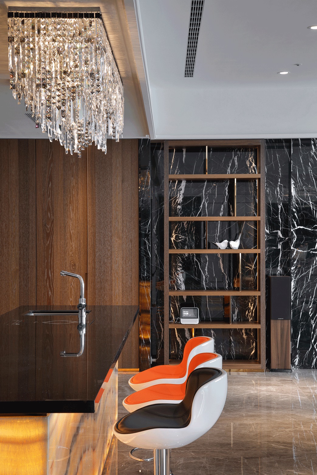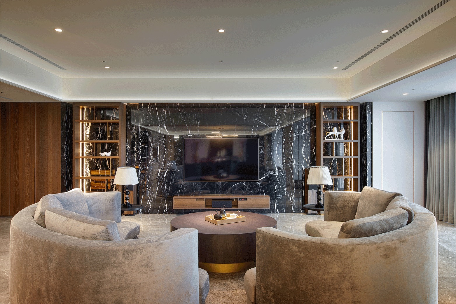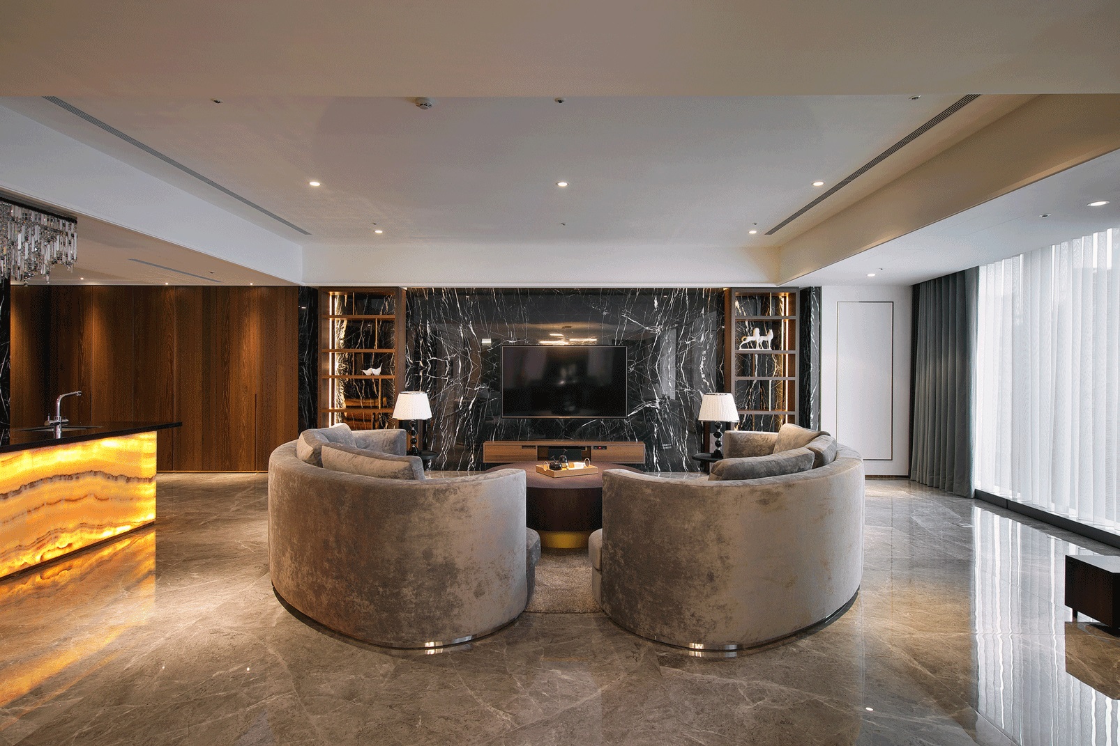 Phong cách Luxury hiện đại: Nổi bật với vách ốp đá marble đen vân trắng sang trọng kết hợp hệ kệ gỗ âm tường tinh tế, mang đến cảm giác quyền quý cho không gian đón tiếp.