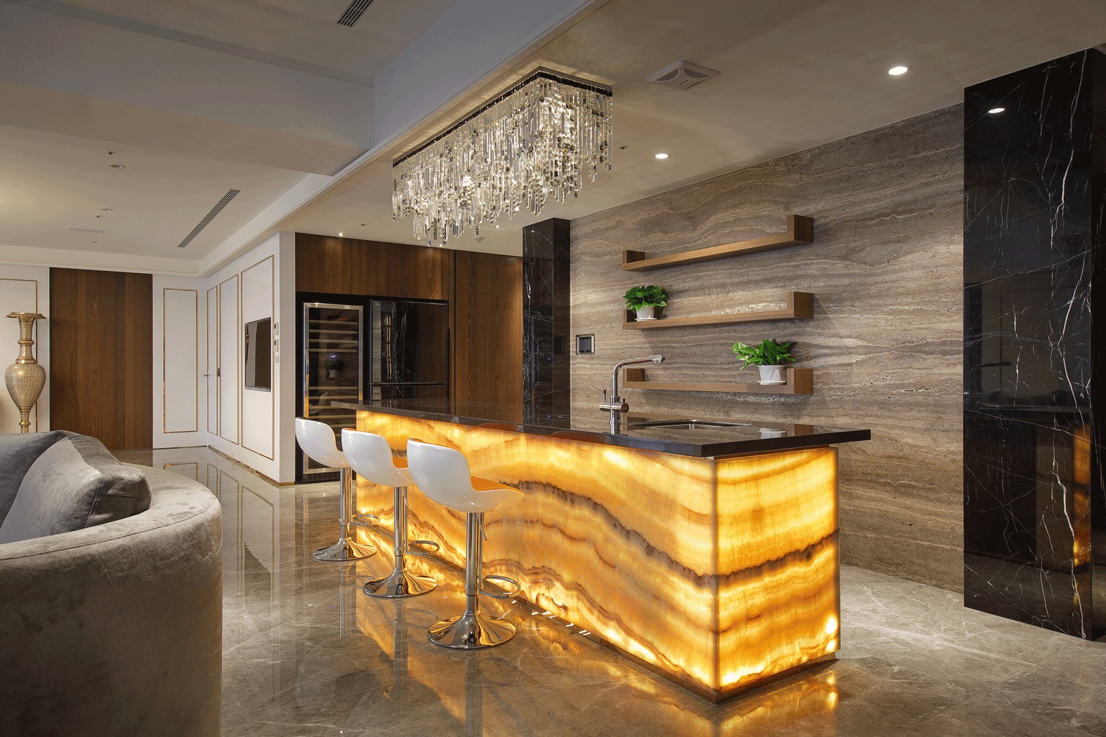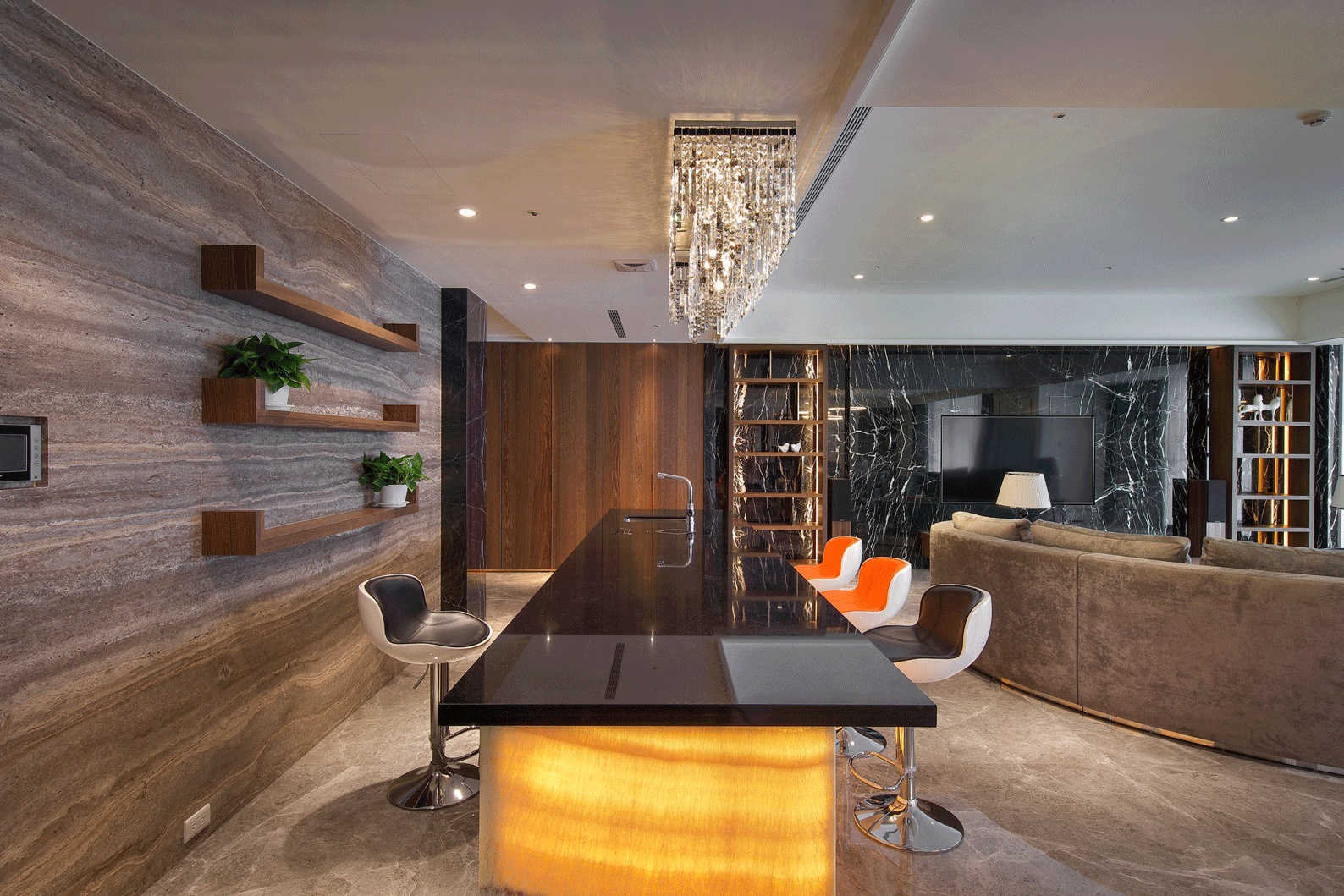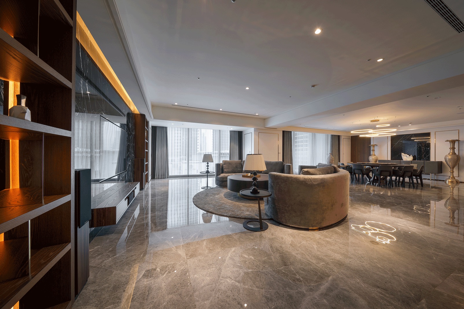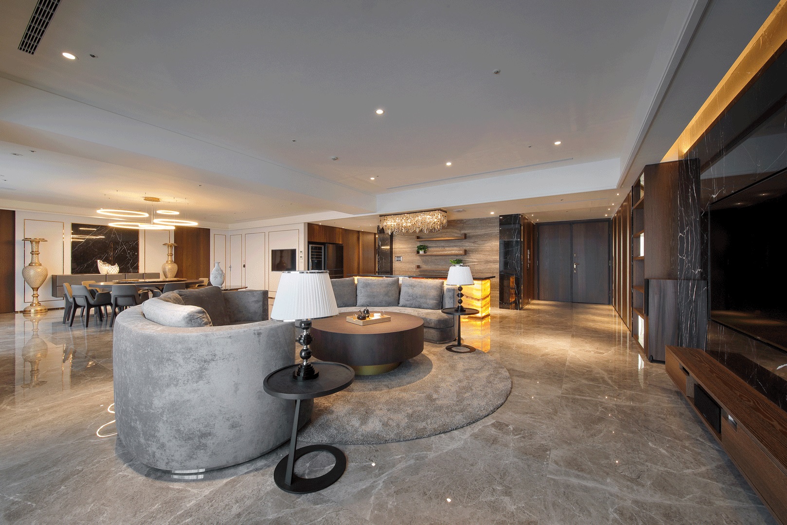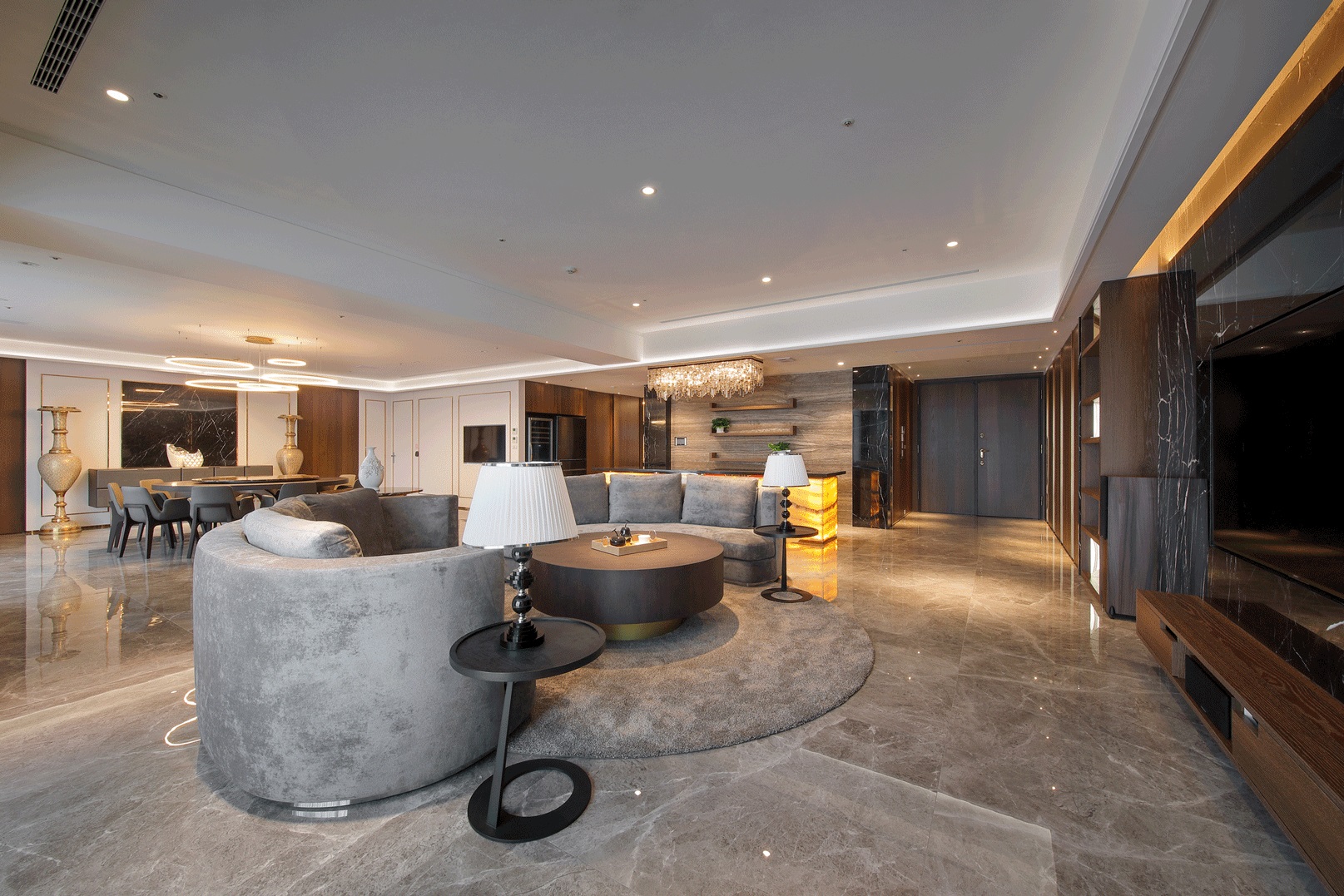 Phong cách Luxury hiện đại: Nổi bật với vách ốp đá marble đen vân trắng sang trọng kết hợp hệ kệ gỗ âm tường tinh tế, mang đến cảm giác quyền quý cho không gian đón tiếp.