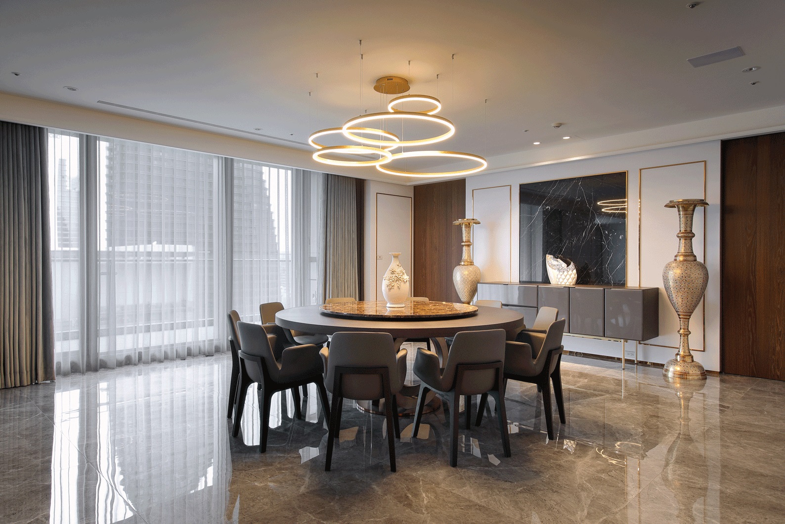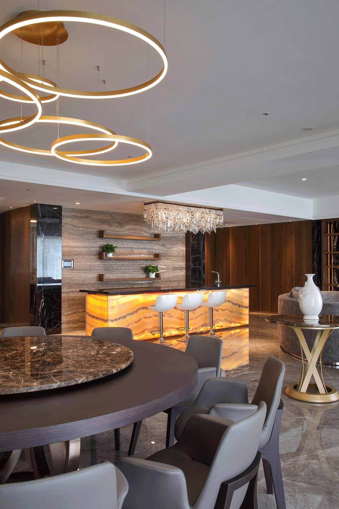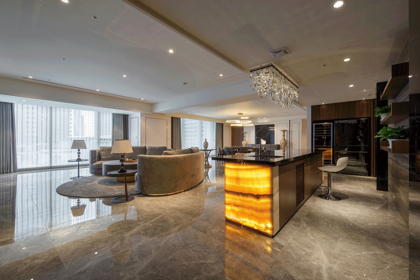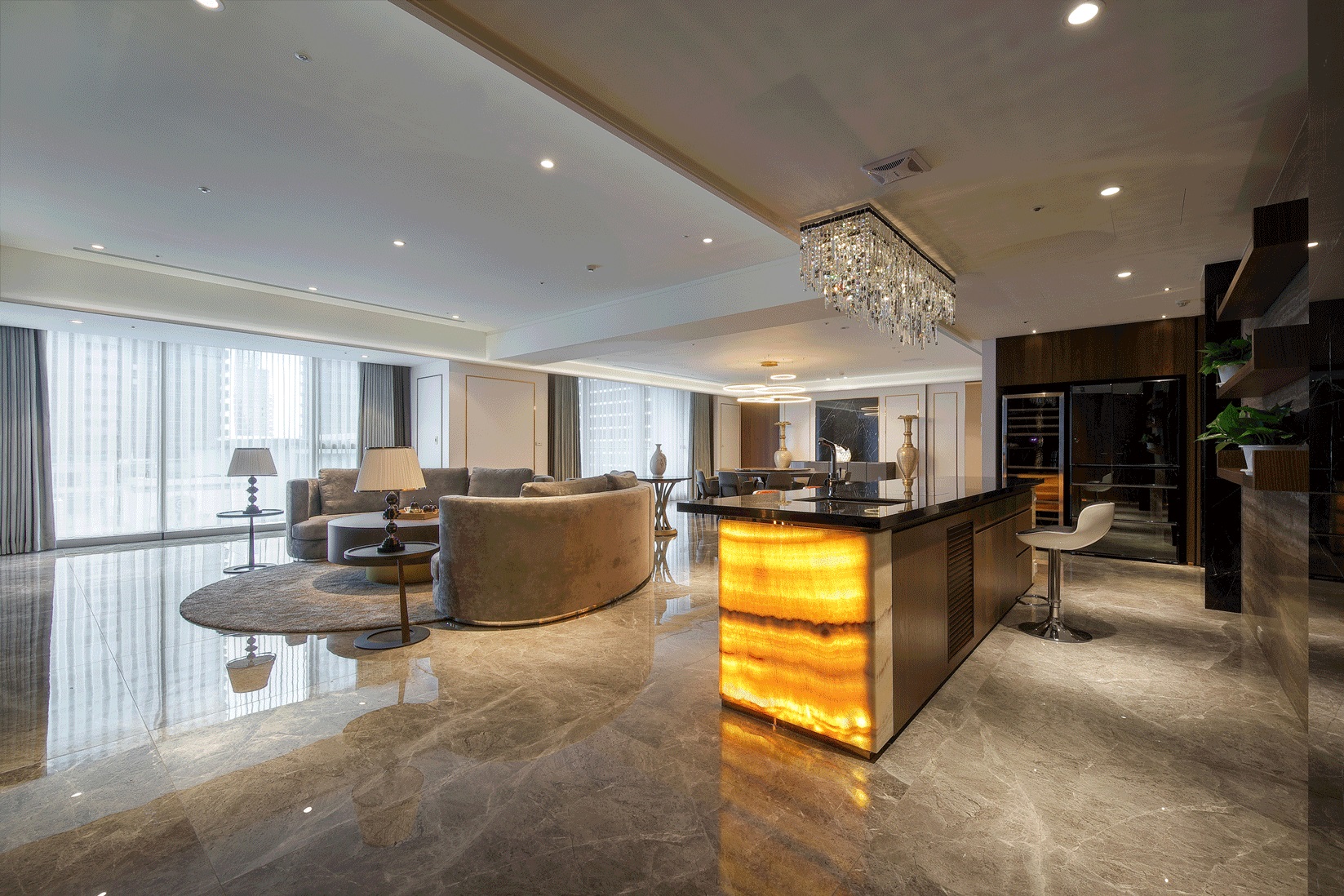 Phong cách Luxury hiện đại: Nổi bật với vách ốp đá marble đen vân trắng sang trọng kết hợp hệ kệ gỗ âm tường tinh tế, mang đến cảm giác quyền quý cho không gian đón tiếp.