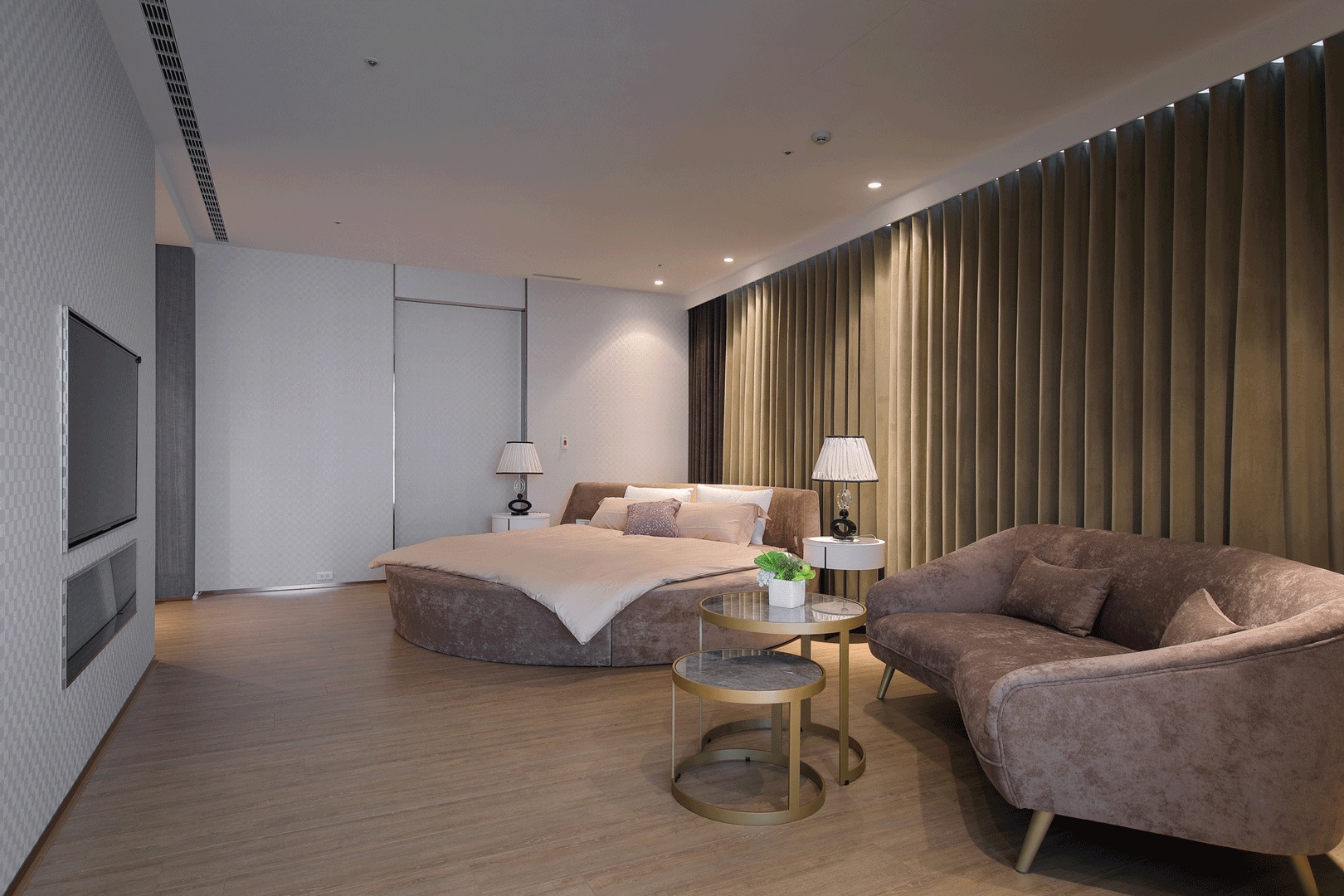 Bàn trà tròn mặt gỗ nâu trầm: Tạo điểm nhấn trung tâm với khay trang trí thanh lịch, giúp cân bằng giữa hiện đại và truyền thống.