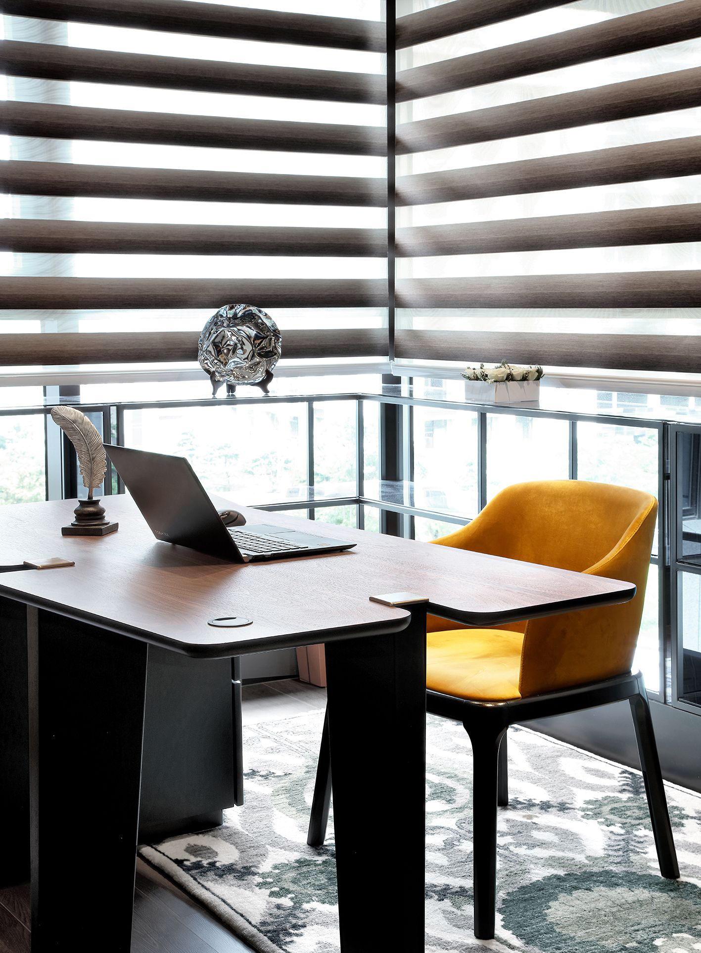 • Bàn ăn mặt đá vân tự nhiên, ghế nỉ tối màu tạo điểm nhấn sang trọng.