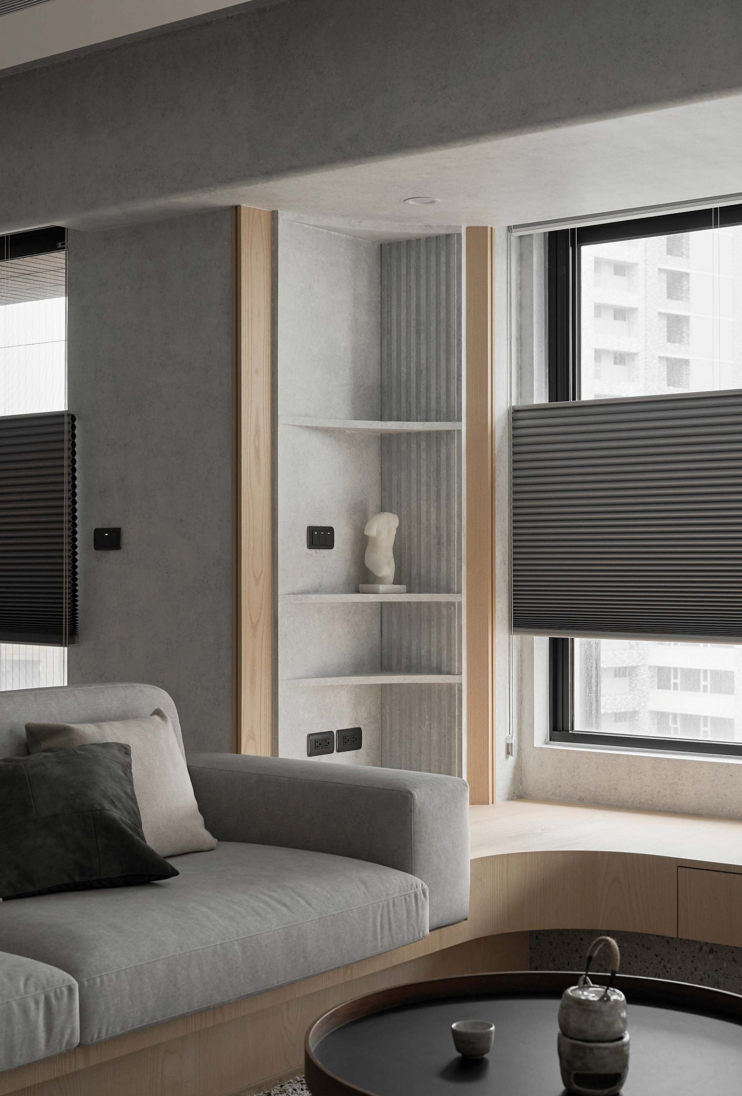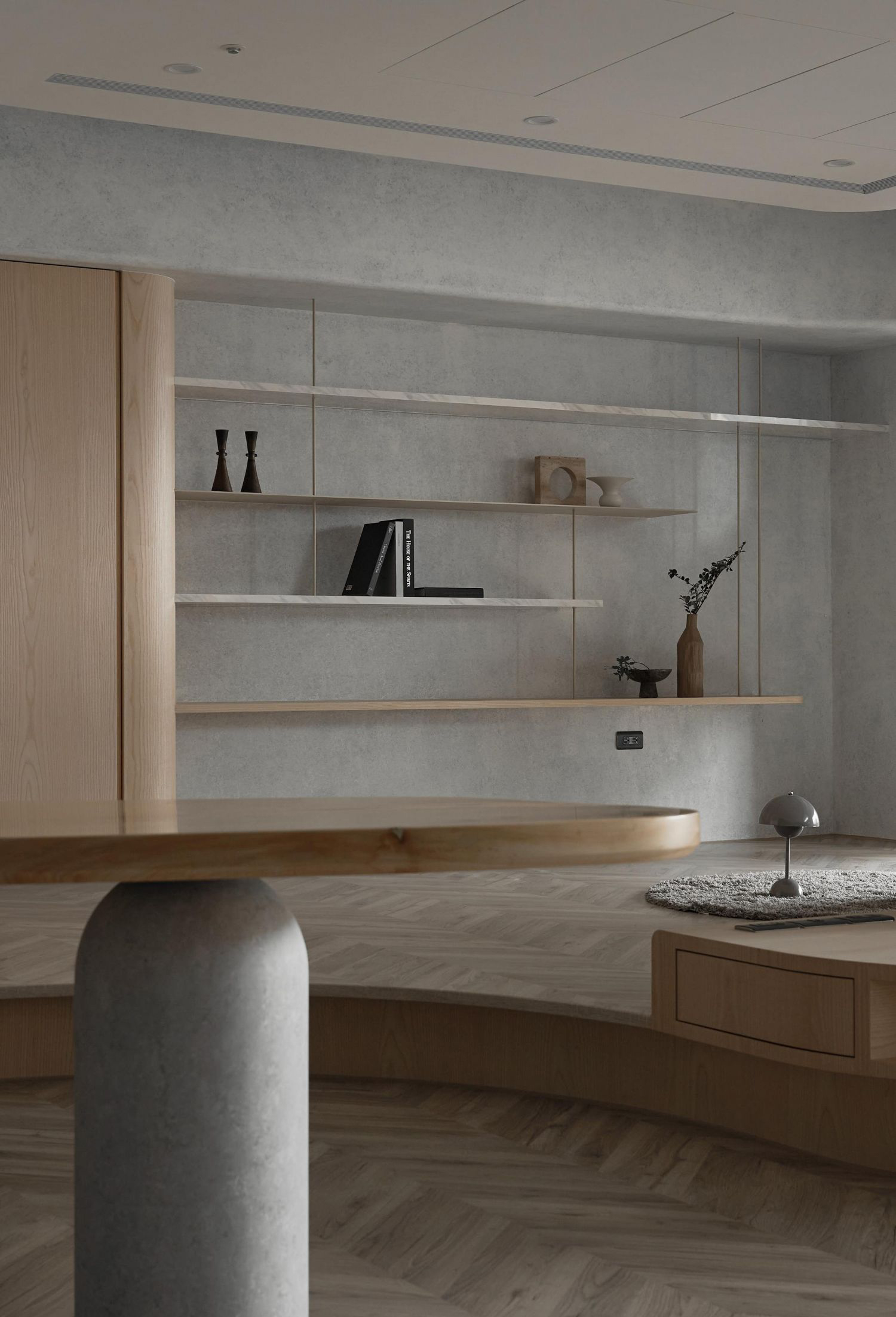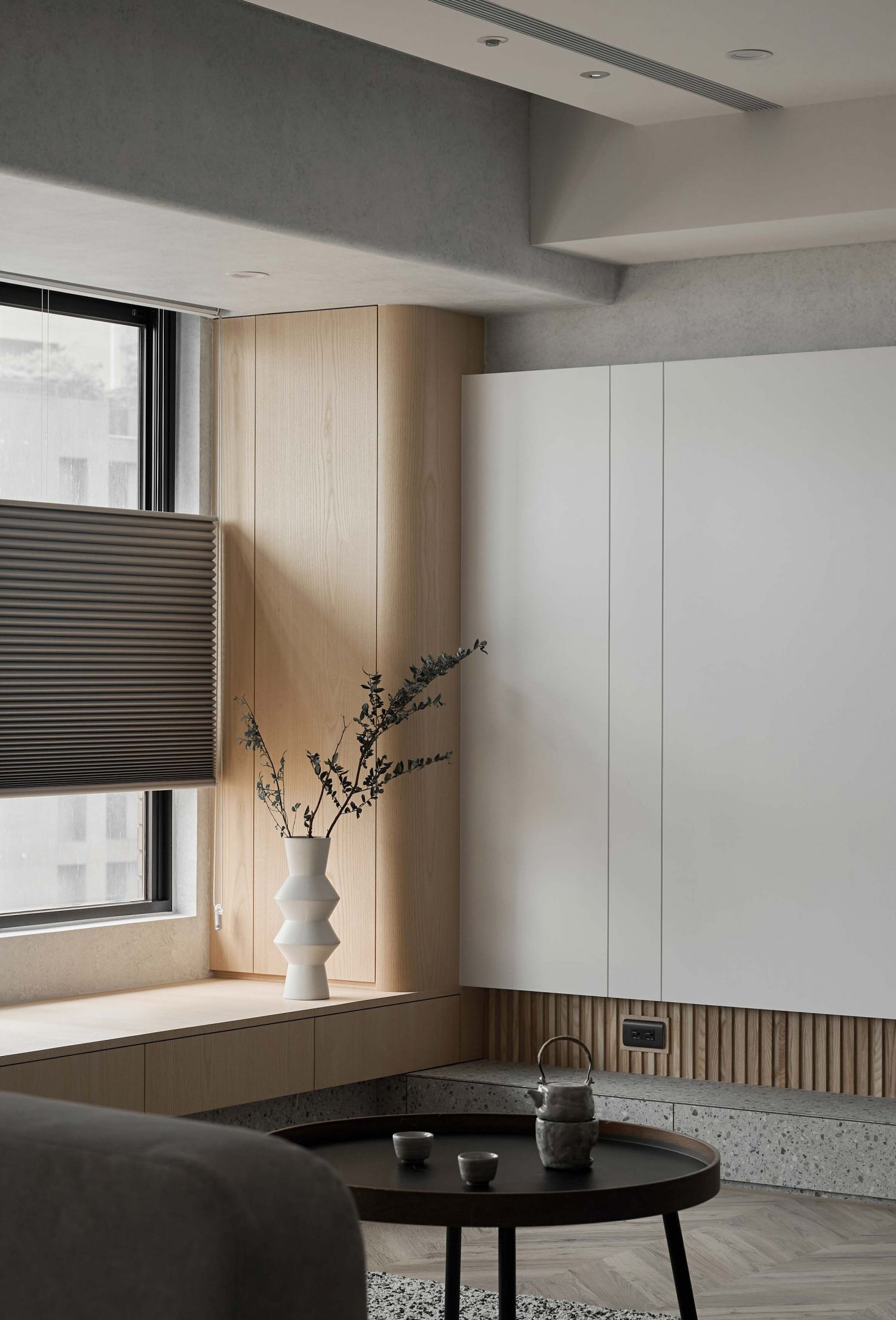 Không gian phòng khách mang đậm nét Hàn Quốc với sofa vải ghi mềm mại, tủ gỗ treo tường tinh tế và sàn gỗ xương cá ấm áp. Thiết kế bo cong nhẹ nhàng, kết hợp tông màu trung tính và ánh sáng tự nhiên tạo cảm giác thanh lịch, thư giãn và hiện đại. Phù hợp cho căn hộ và nhà phố yêu thích sự tối giản và tinh tế.