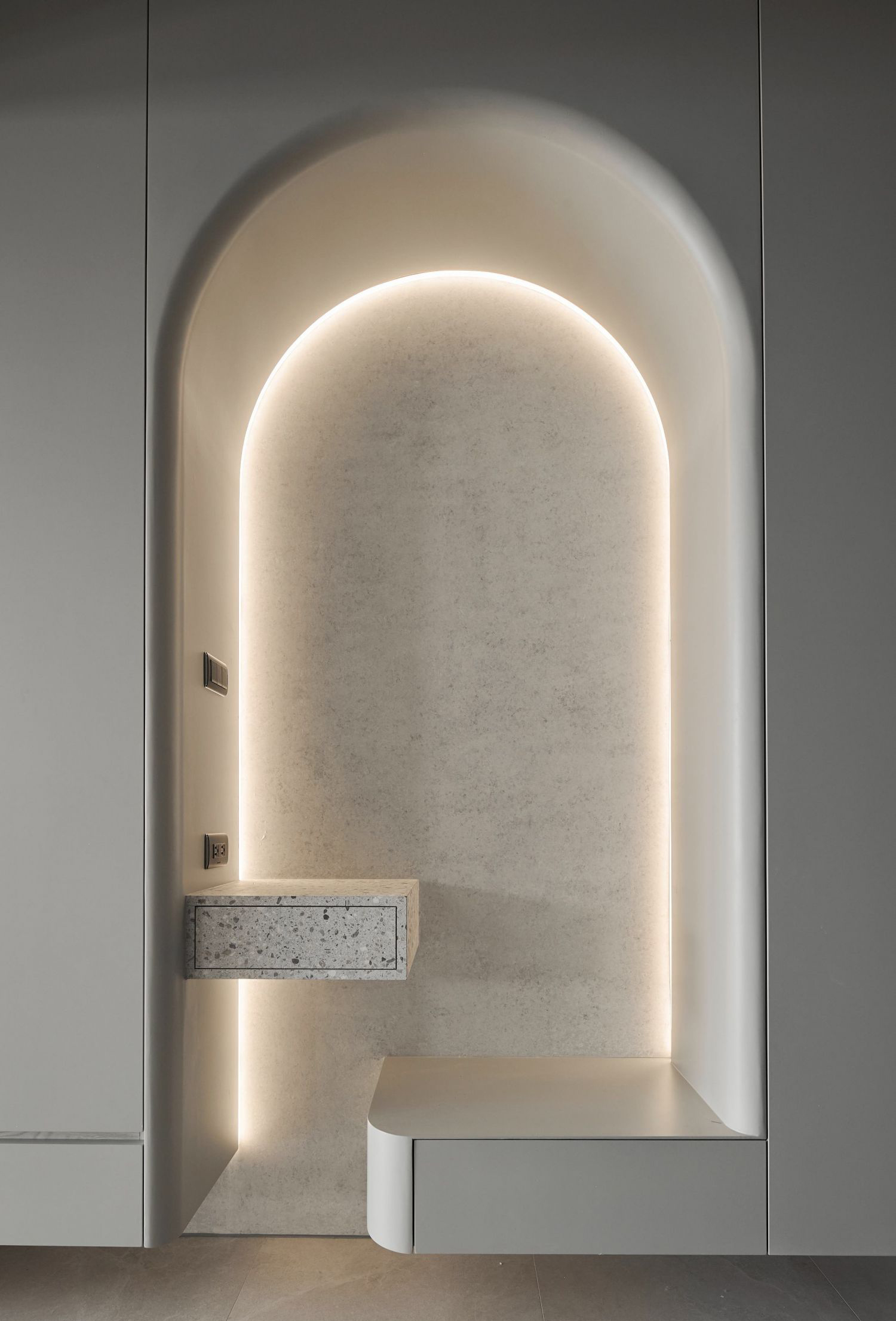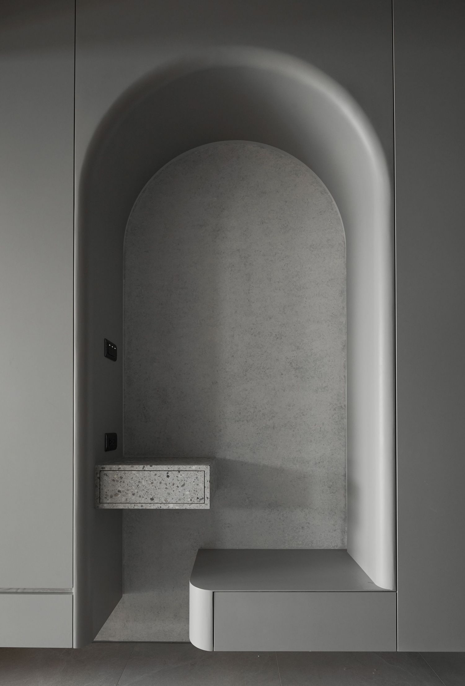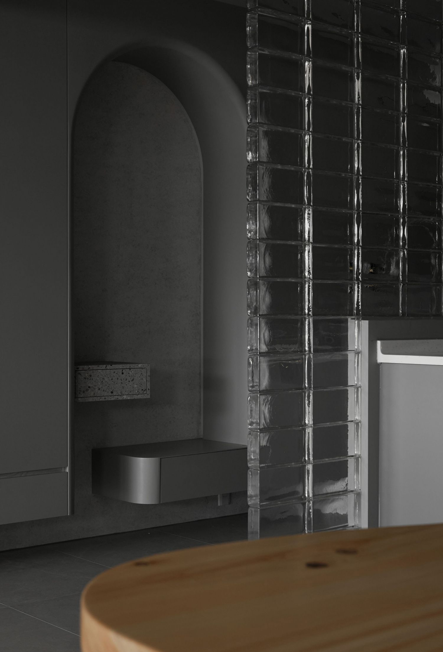 Không gian phòng khách mang đậm nét Hàn Quốc với sofa vải ghi mềm mại, tủ gỗ treo tường tinh tế và sàn gỗ xương cá ấm áp. Thiết kế bo cong nhẹ nhàng, kết hợp tông màu trung tính và ánh sáng tự nhiên tạo cảm giác thanh lịch, thư giãn và hiện đại. Phù hợp cho căn hộ và nhà phố yêu thích sự tối giản và tinh tế.