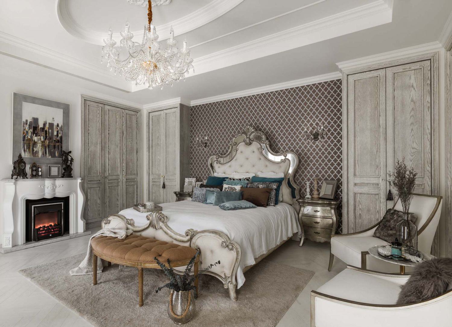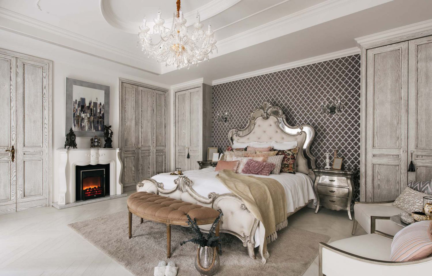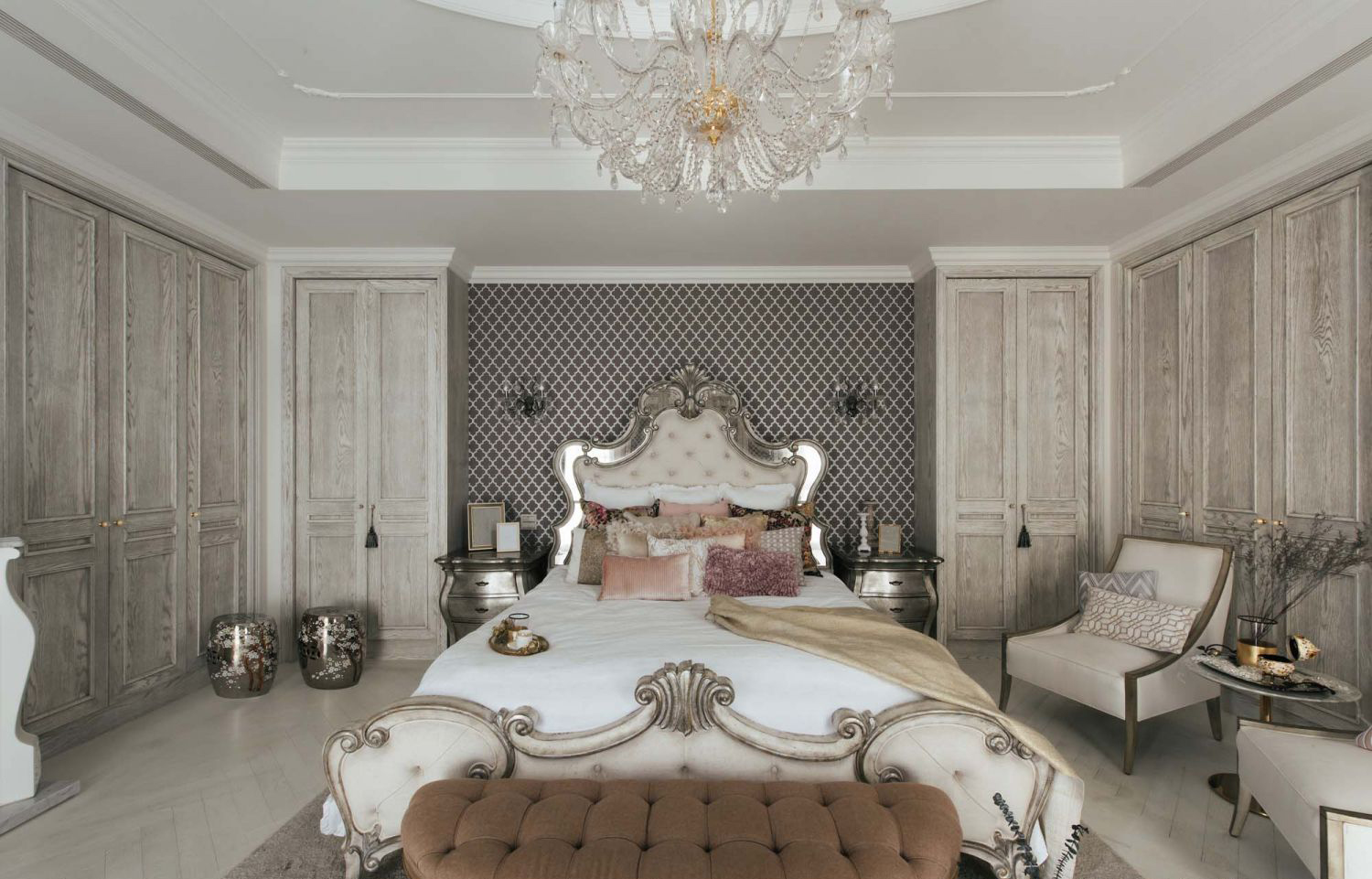 Tường đầu giường: Sử dụng giấy dán tường họa tiết hình học cổ điển với màu sắc trung tính tương phản nhẹ, tạo chiều sâu và cảm giác sang trọng cho không gian.