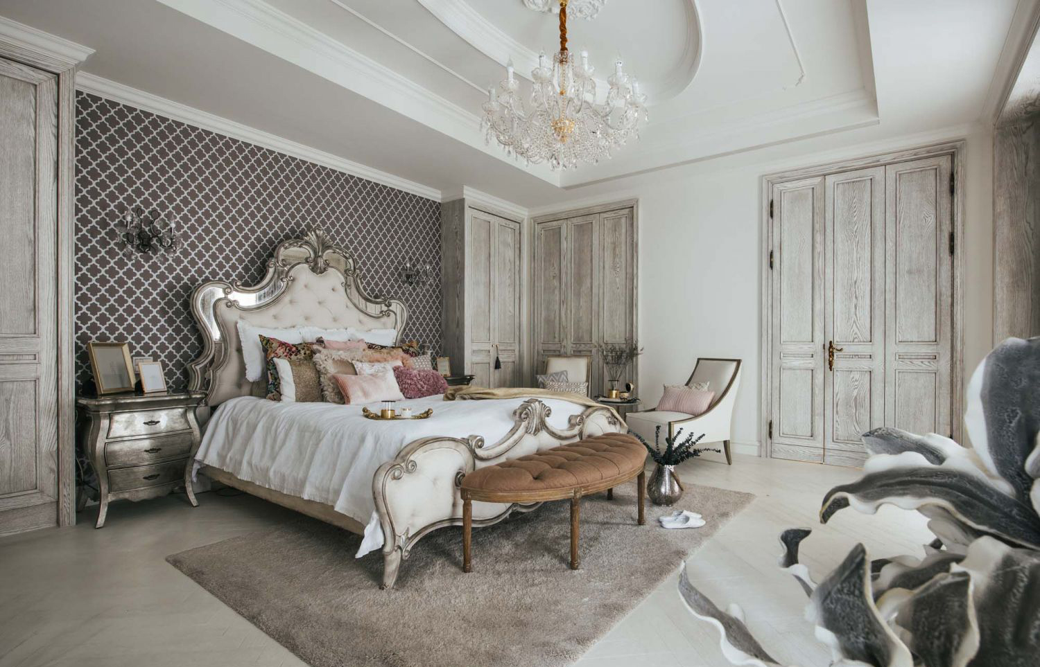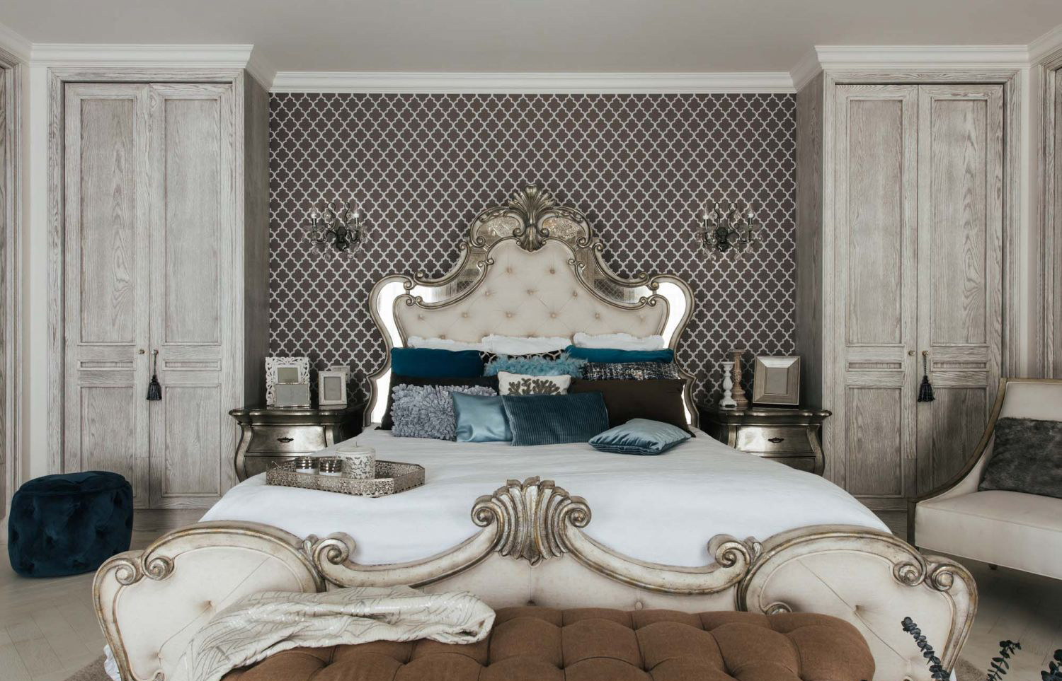 Táp đầu giường: Hai bên đầu giường là táp gỗ cong ánh bạc, bề mặt gương sáng bóng, góp phần tăng độ phản chiếu ánh sáng và mang lại nét kiêu sa cho căn phòng.