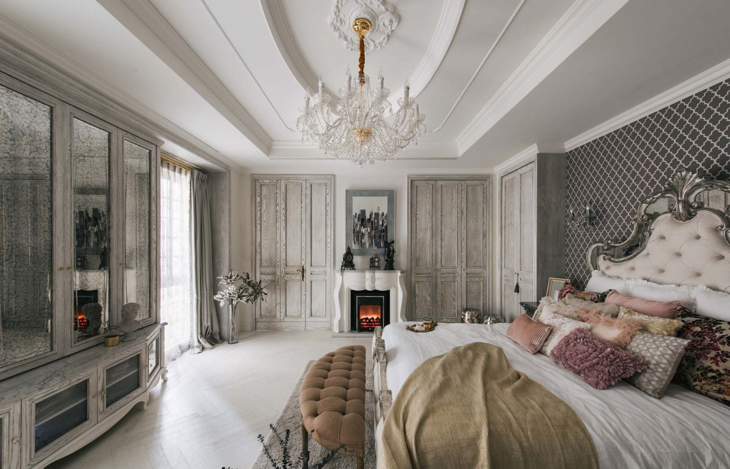 Chăn ga: Bộ chăn ga gối đa lớp với nhiều chất liệu mềm mại, điểm nhấn là các gối trang trí có họa tiết vải dệt nổi, ren và nhung, tạo chiều sâu cho tổng thể chiếc giường.