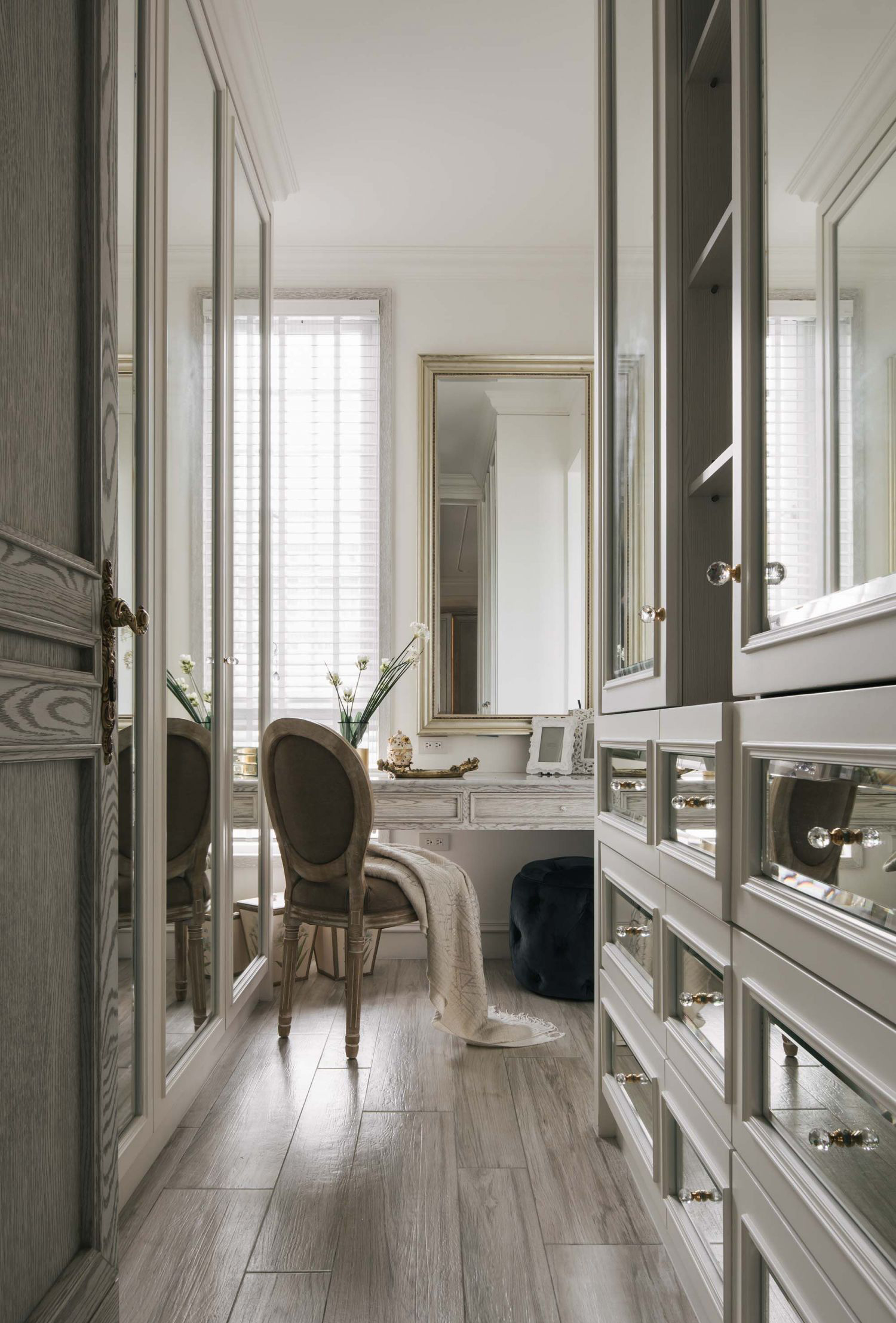 Tủ quần áo âm tường hoặc walk-in closet với hệ đèn LED cảm ứng