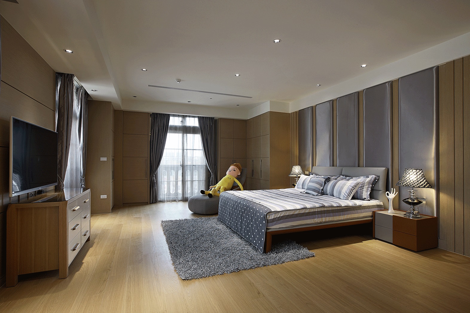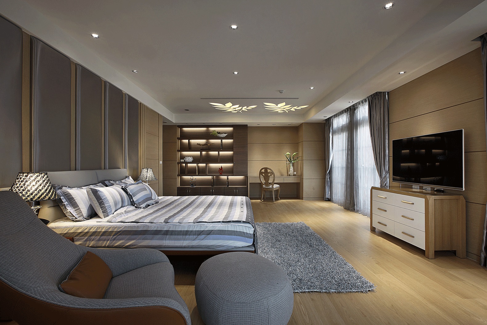 Chăn ga: Bộ chăn ga gối màu xám nhạt hoa văn chìm tinh tế, mang lại cảm giác nhẹ nhàng, dễ chịu cho người sử dụng.