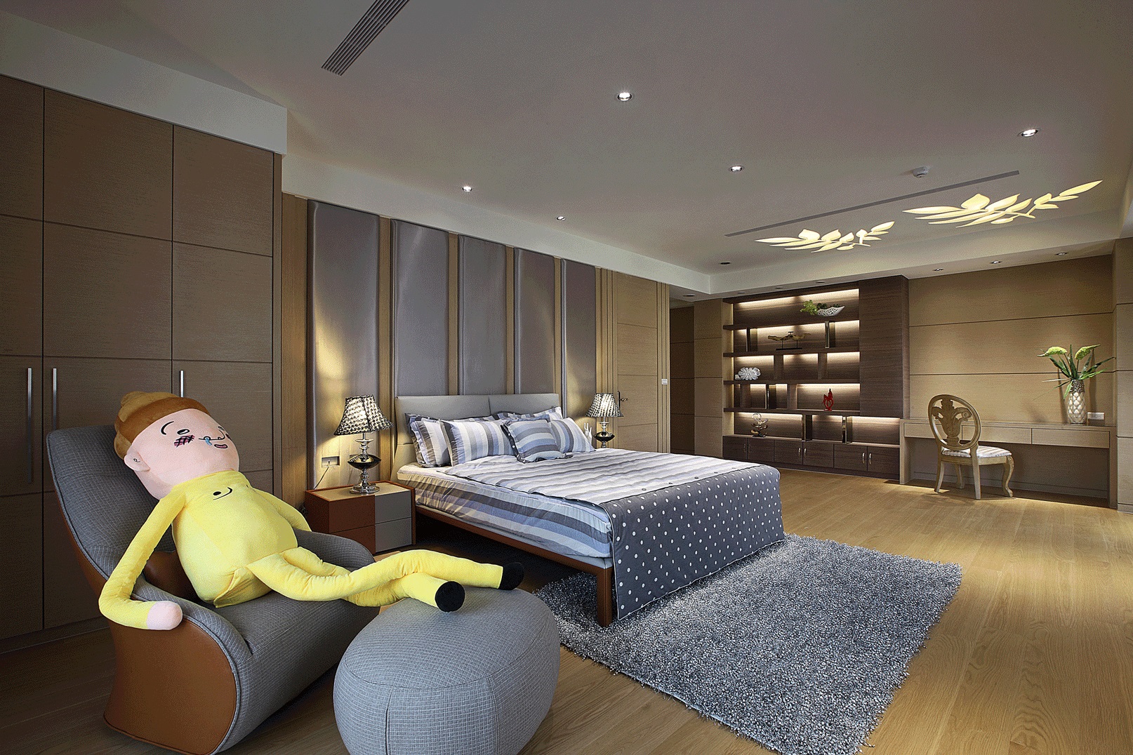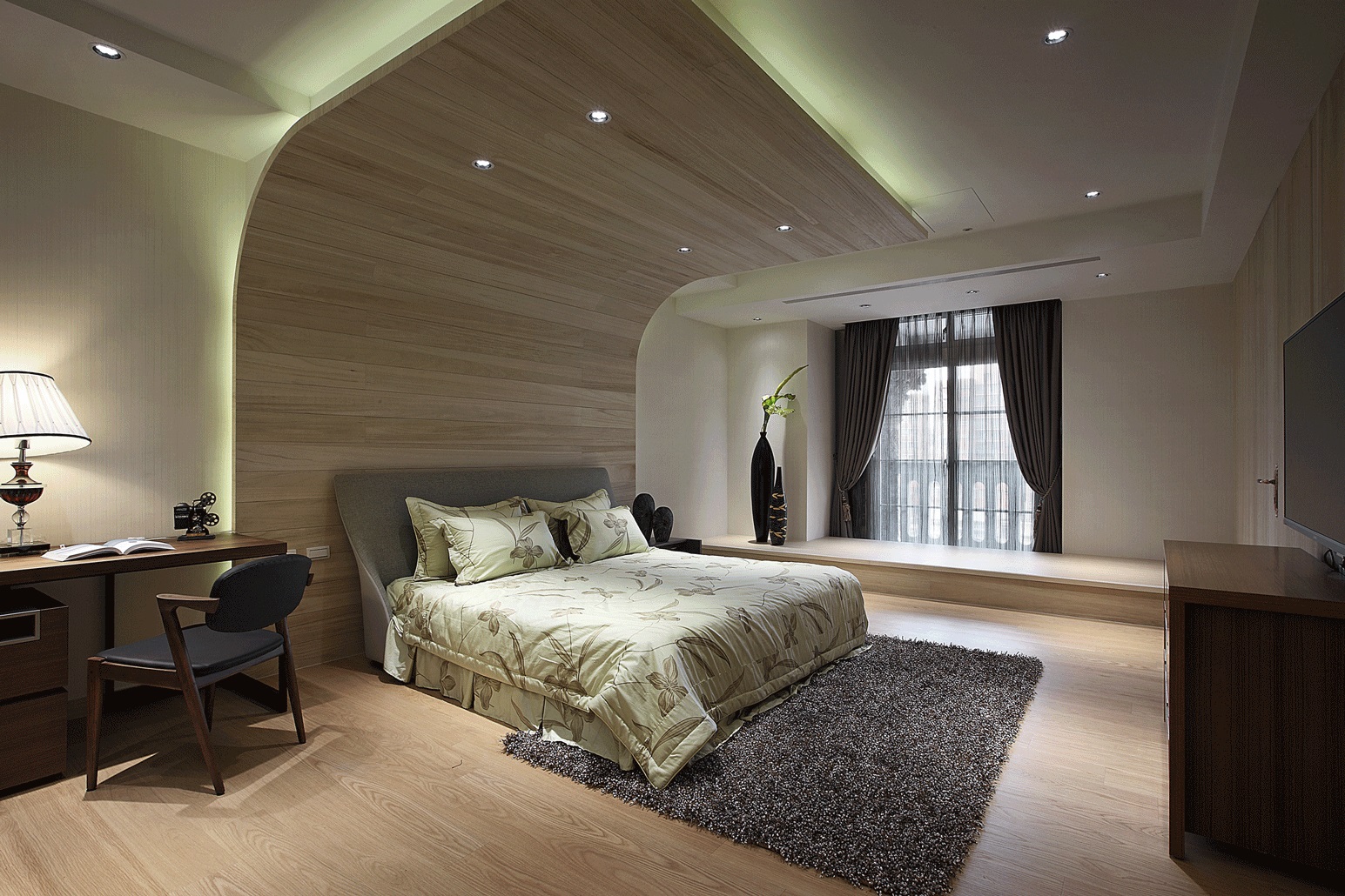 Đầu giường: Tích hợp hệ đèn ngủ đối xứng hai bên với đèn để bàn cổ điển, ánh sáng vàng dịu nhẹ, rất phù hợp để đọc sách hoặc thư giãn ban đêm.