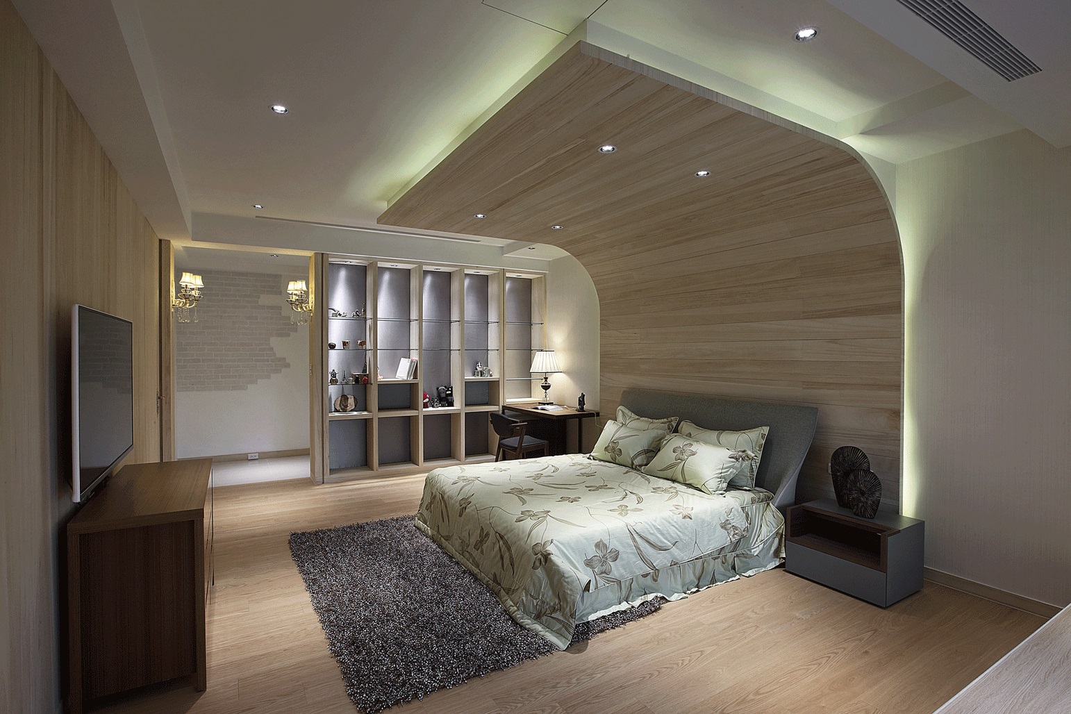 Trần nhà: Trần thạch cao giật cấp kết hợp hệ đèn âm trần LED hiện đại, chiếu sáng đều và tạo chiều sâu cho phòng.