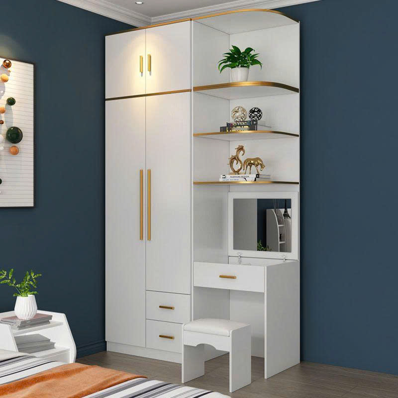 Bên phải tích hợp bàn trang điểm nhỏ gọn với gương, ngăn kéo và ghế ngồi cùng tone màu, rất phù hợp cho các chị em.