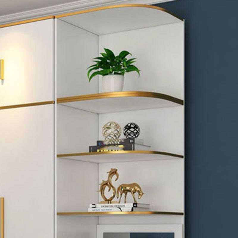 Góc phải là hệ kệ trang trí cong mềm mại, với các tầng mở để trưng bày sách, cây xanh, hoặc đồ decor tạo điểm nhấn nghệ thuật cho không gian.